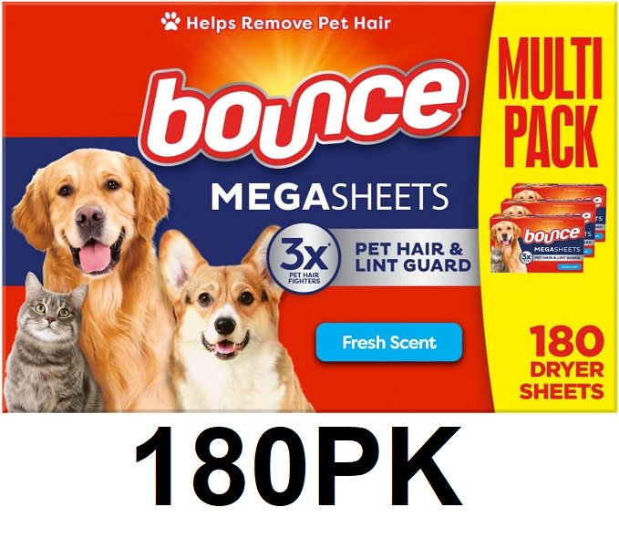 180PK Bounce Pet Hair and Lint Guard Mega Dryer Sheets for Laundry - FRESH SCENT - WHITE