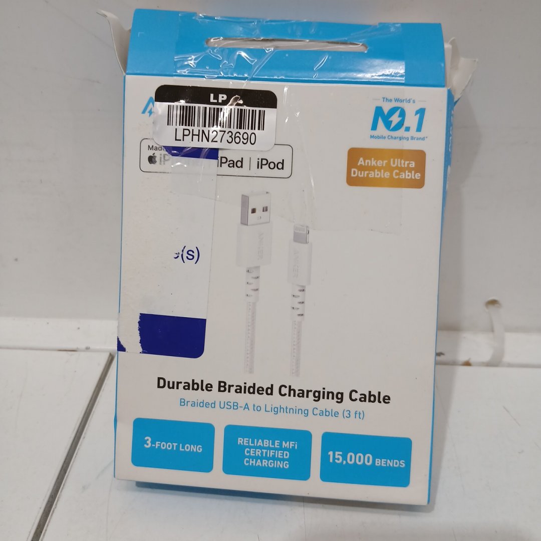 Anker durable Braided Charging Cable - USB-A to lightning - 3ft - White (Model: A8012H21-1)