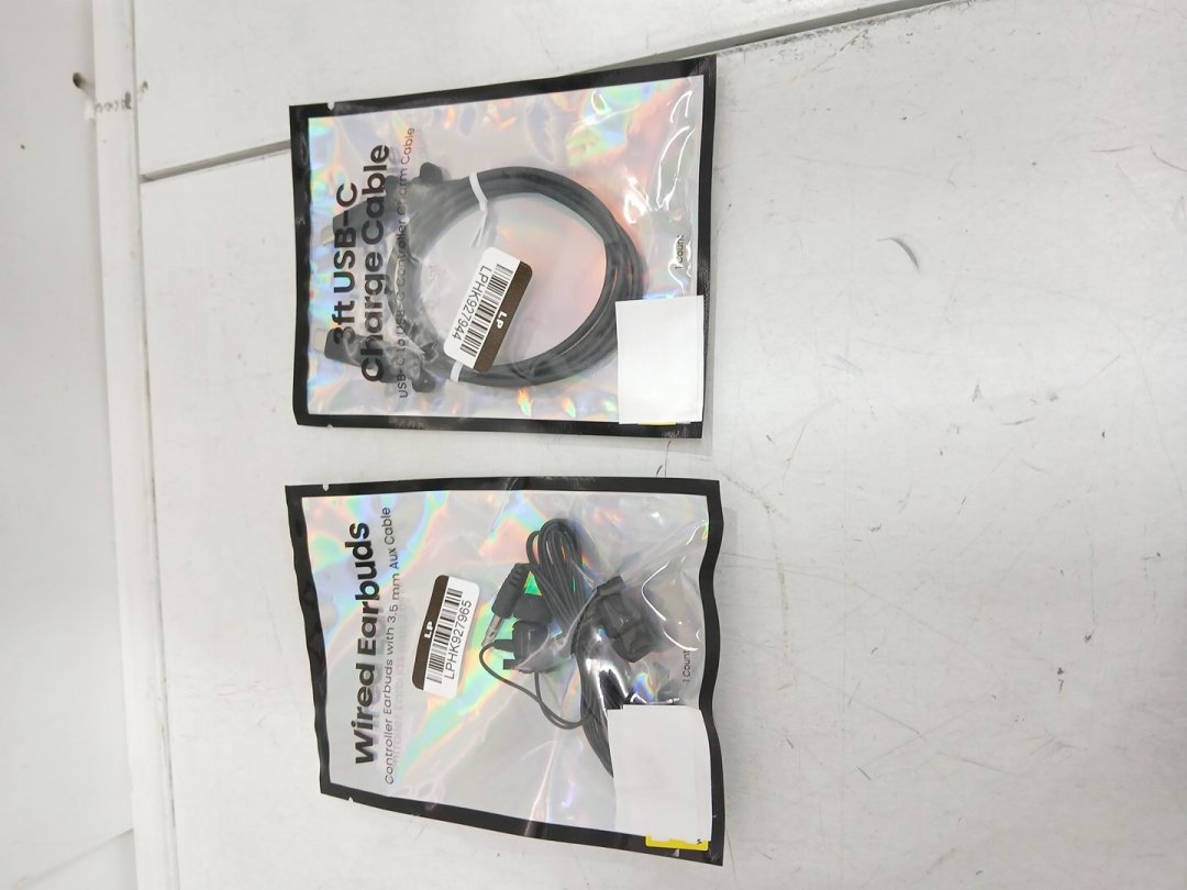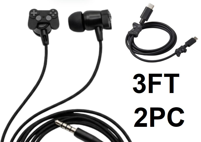 2pc gems decorative novelty usb-c to usb-c charging cord and 3.5mm wired earbuds set - 3ft - black gaming controller