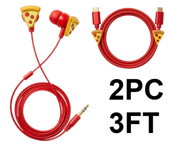2pc gems decorative novelty usb-c to usb-c charging cord and 3.5mm wired earbuds set - 3ft -RED PIZZA