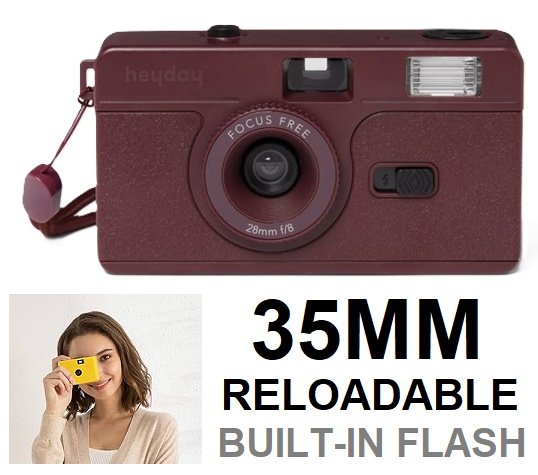 heyday 35mm reloadable camera with built in flash - dark cherry