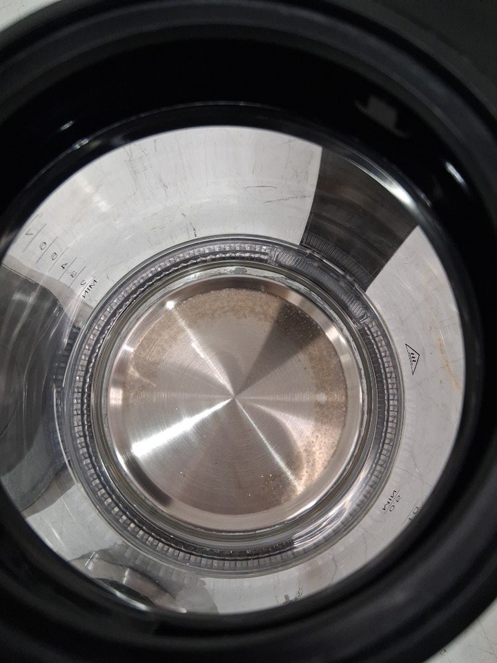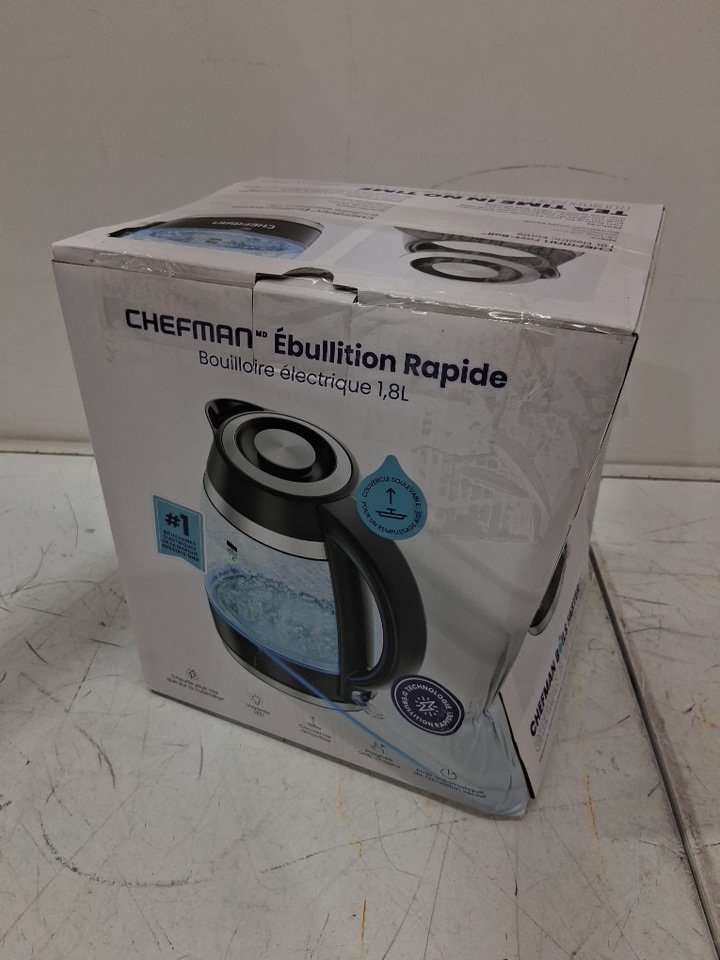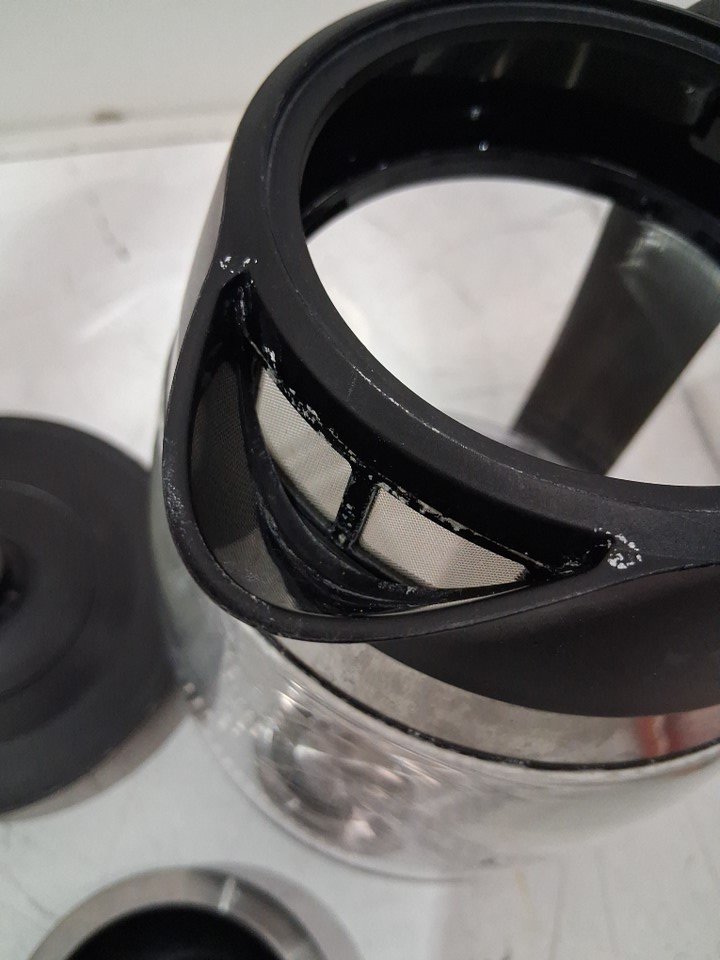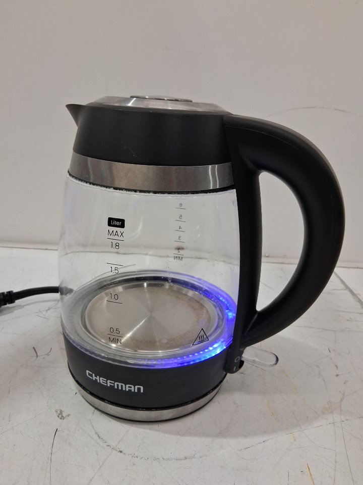 Discoloration on inside bottom of the kettle and water/mineral residue on the glass and spout. Tested for power.