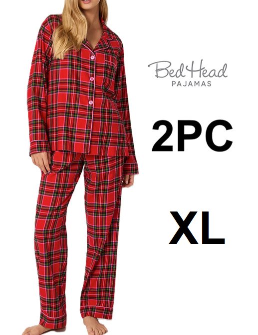 2PC WOMENS BED HEAD PAJAMAS LONG SLEEVE BUTTON UP SHIRT AND PANTS SET - EXTRA LARGE - RED PLAID