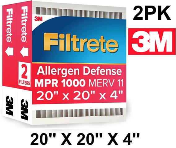2pk Filtrete aC Furnace Air Filter MPR 1000, MERV 11, Fits Honeywell, Allergen Defense, Electrostatic Air Cleaning Filter - 20'' x 20'' x 4'' - (model: ‎NADP02-2PK-1E)