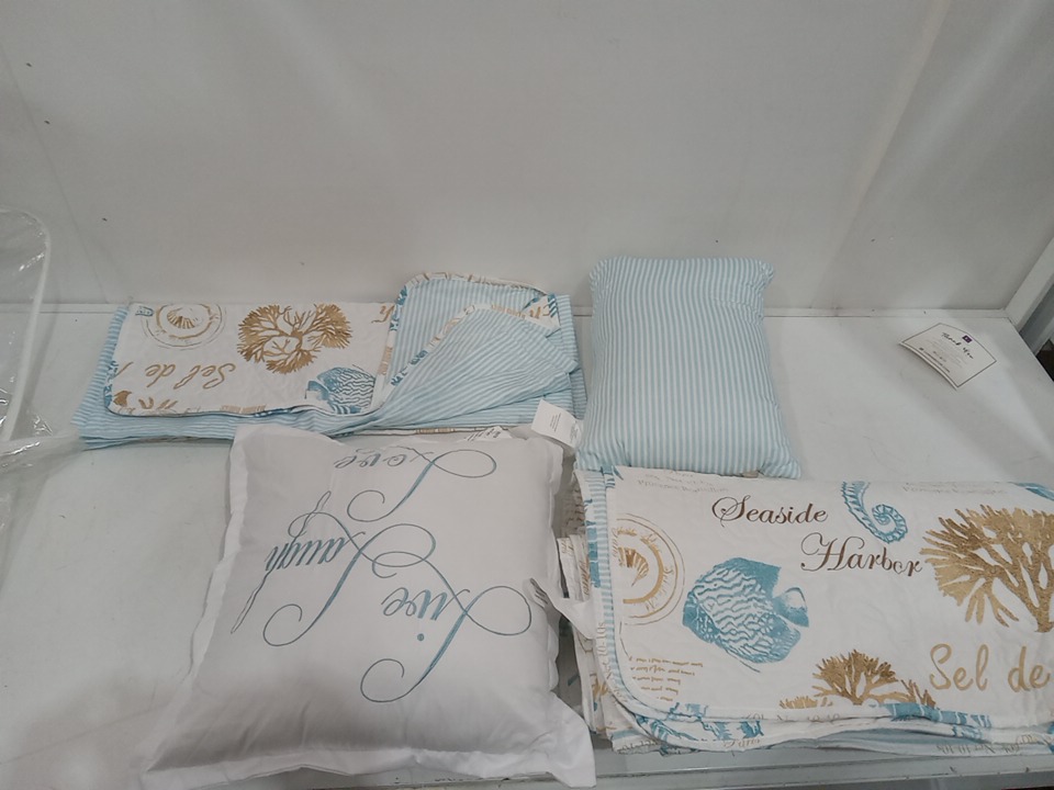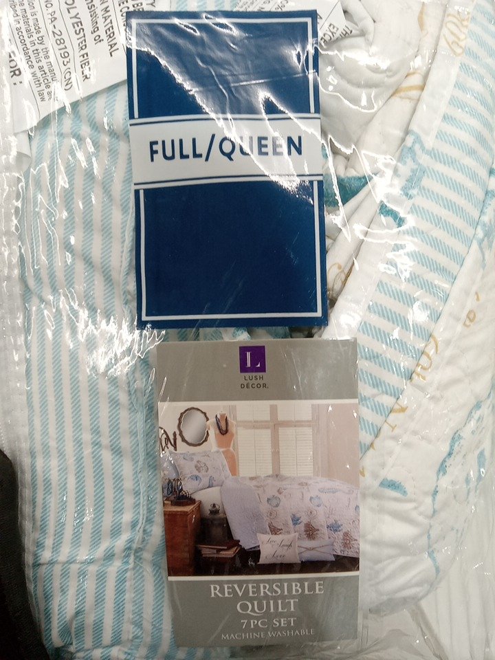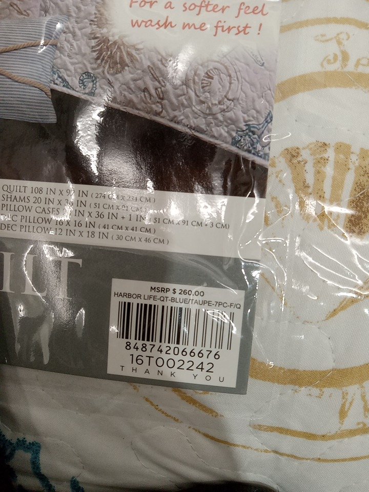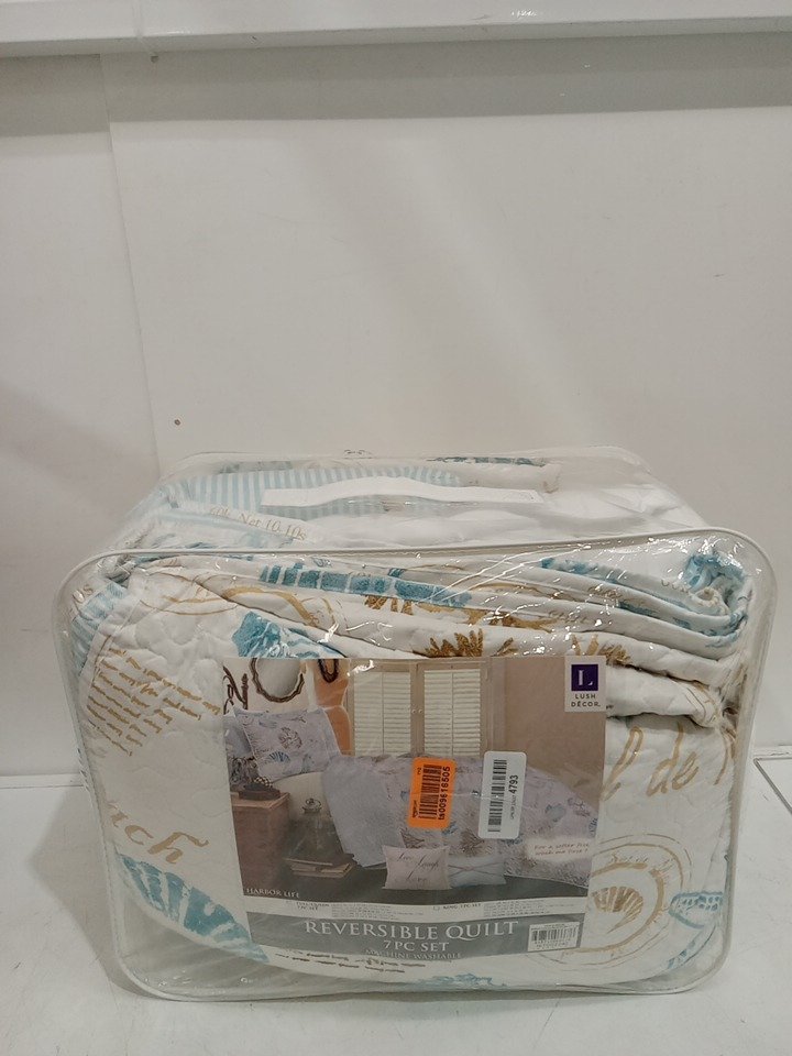 7PC LUSH DECOR HARBOR LIFE QUILT SET - REVERSIBLE - QUEEN - BLUE AND TAUPE