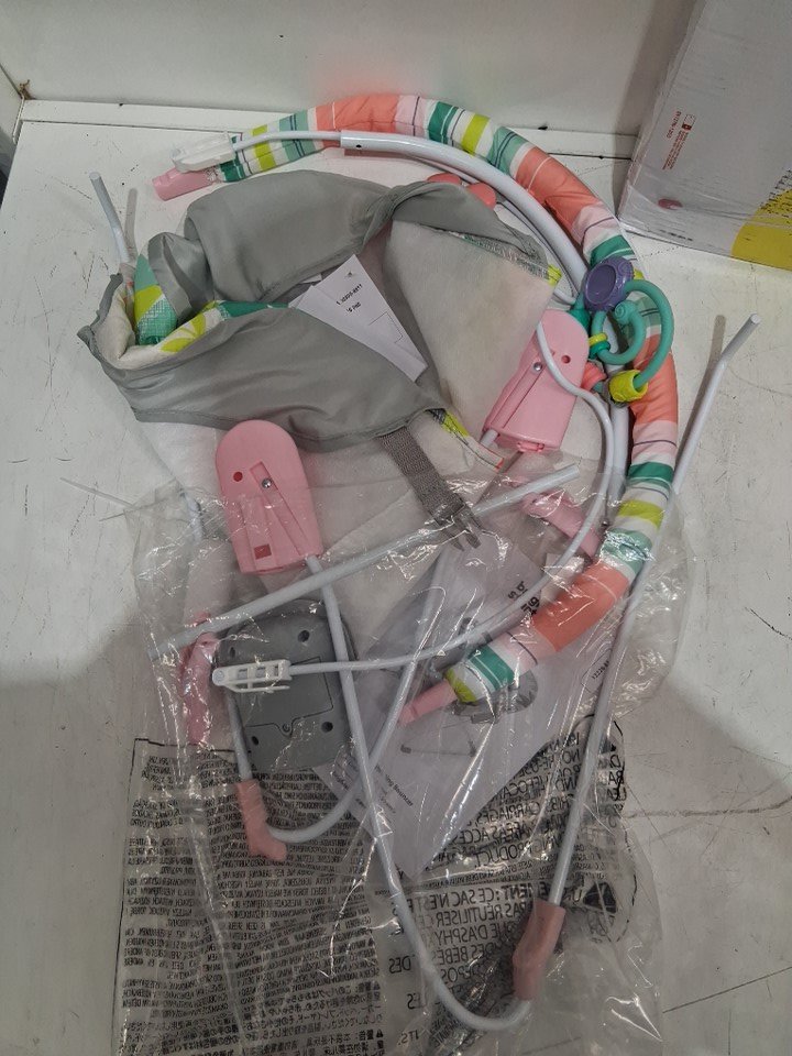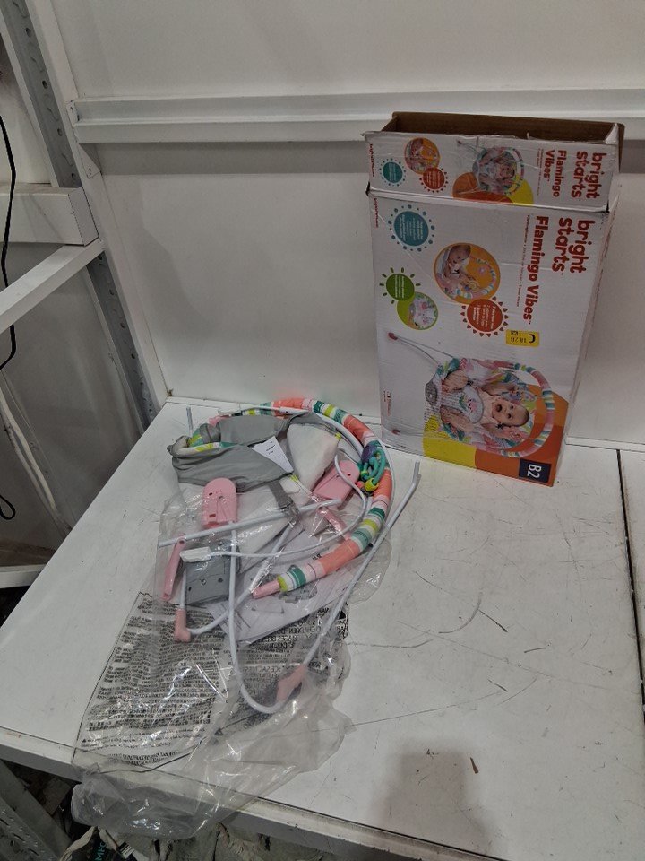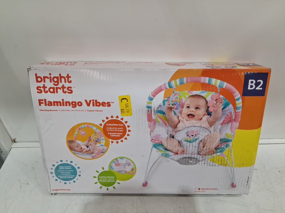 BRIGHT STARTS 3-POINT HARNESS VIBRATING BABY BOUNCER WITH TOY BAR - FLAMINGO VIBES (MODEL: 12228-ES)