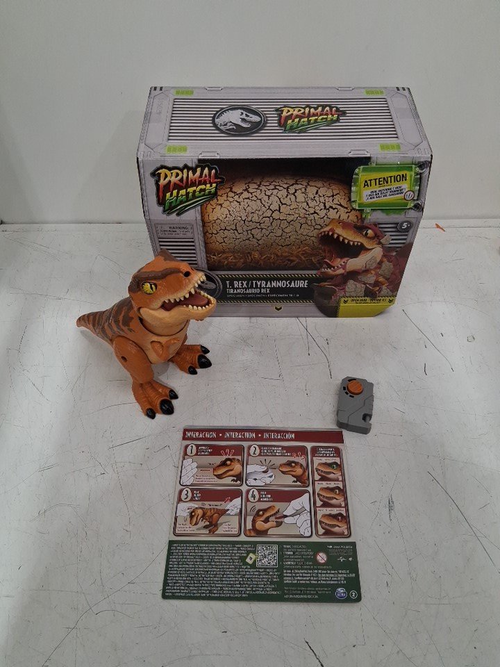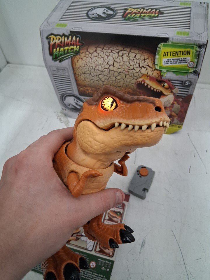 The egg was previously cracked open, the small steak piece is missing from the set, it only comes with the dinosaur and the small remote. The dinosaur was tested for basic power.
