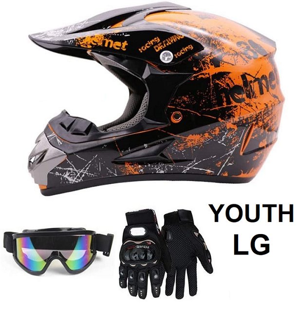 YOUTH SANQING VIRTUE ADULT DIRT BIKE/MOTOCROSS HELMET - UNISEX OFF-ROAD MOUNTAIN BIKE HELMET - FMVSS-218 DOT APPROVED - COMES WITH GLOVES, GOGGLES - LARGE (58-60CM) -ORANGE/BLACK