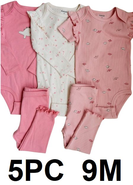 5PC Pekkle infant long sleeved bodysuits one short sleeved bodysuit and two pairs of pants - 9 months - pink (style: 1281212)