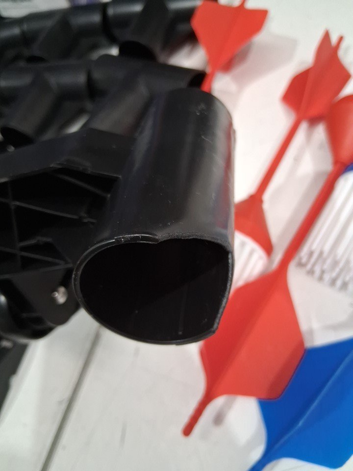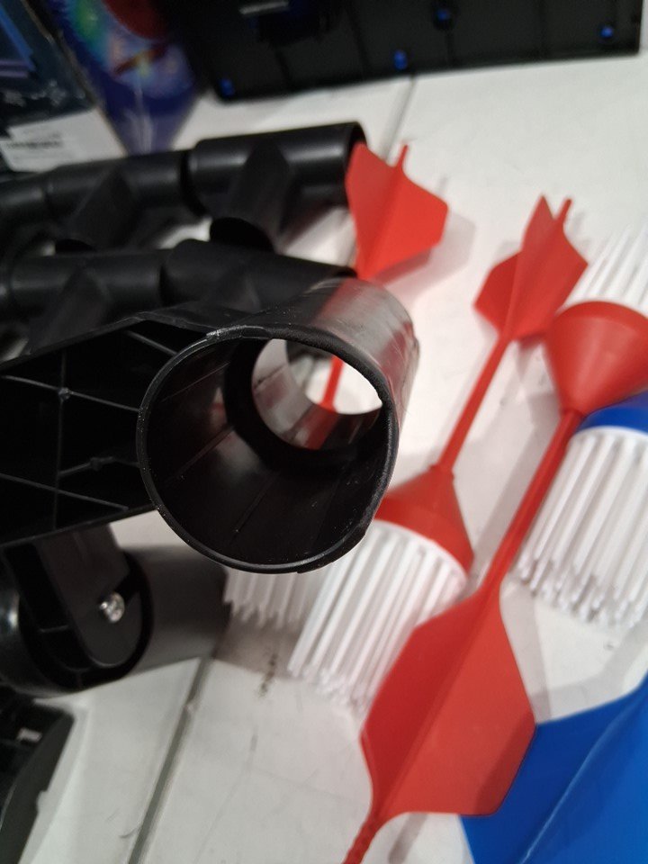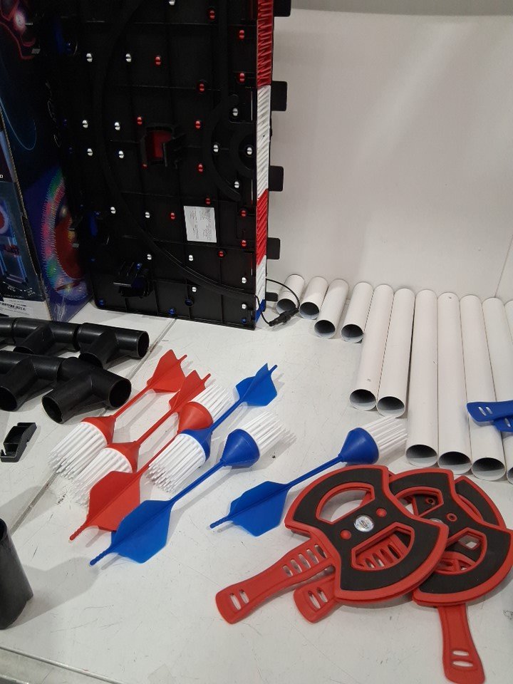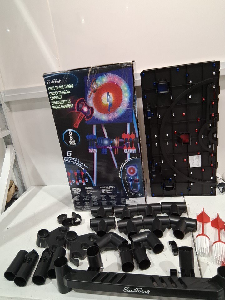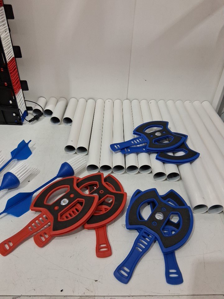 Tested board for power/lights. Missing 1 red throwing axe. The pole connectors ah the back of the board and the one that holds the axes is damaged/broken. Parts are scuffed from use/being assembled.