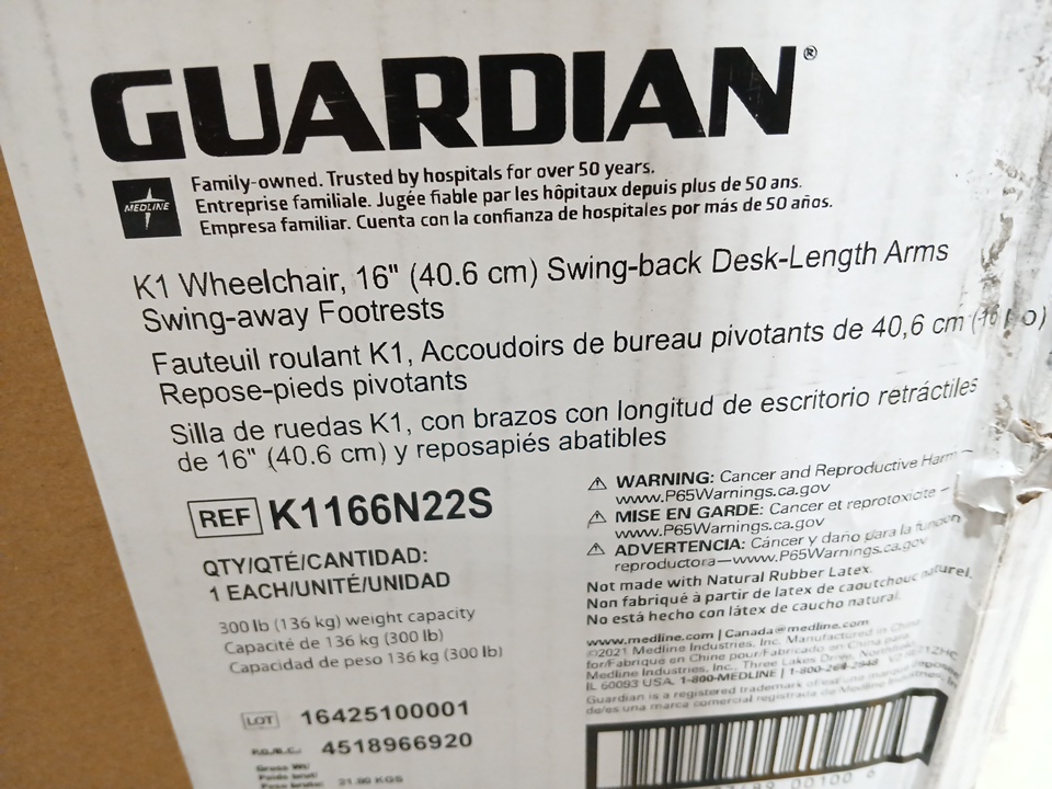 MEDLINE GUARDIAN K1 WHEELCHAIR - 16" - 300LB CAP - BLACK (MODEL: K1166N22S)