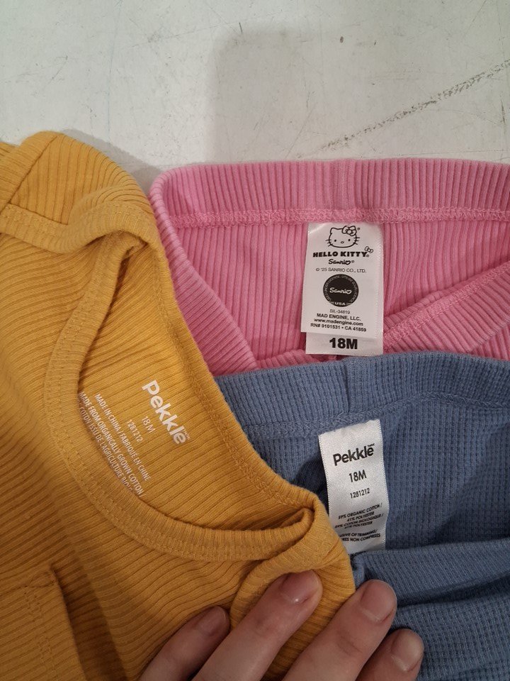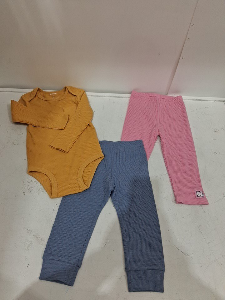 3 ASSORTED TODDLER GIRLS CLOTHES - (2) PANTS (1) LONG SLEEVE ONESIE - 18M - YELLOW / BLUE / PINK