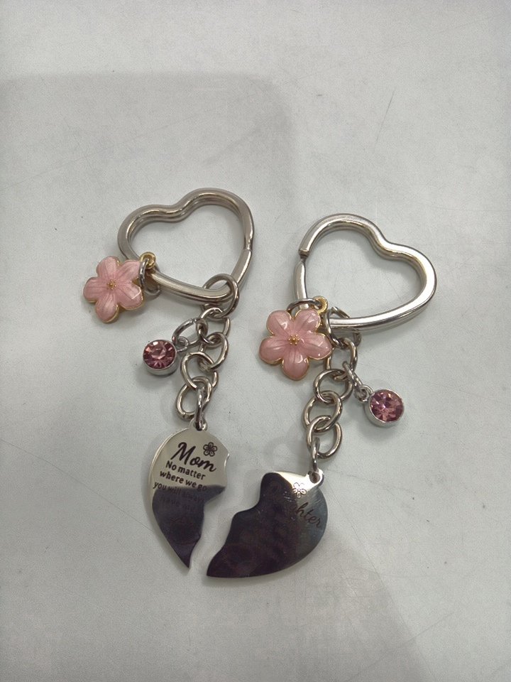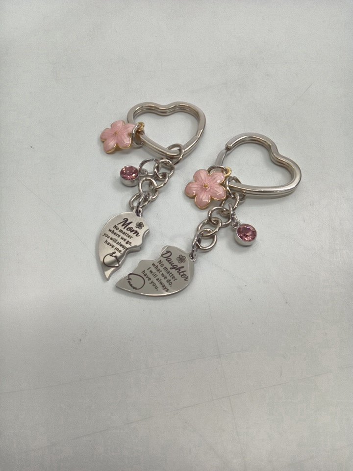 2PC HOFULL Mother-Daughter Heart Keychain with Pink Crystal - 3.5" - STAINLESS STEEL