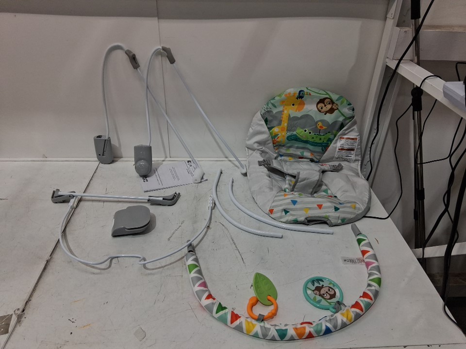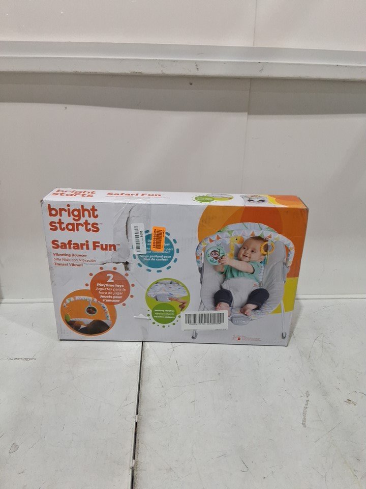 bright starts vibrating bouncer with 3-point harness and removable toy bar - 20lb max - safari fun (model: 12204)