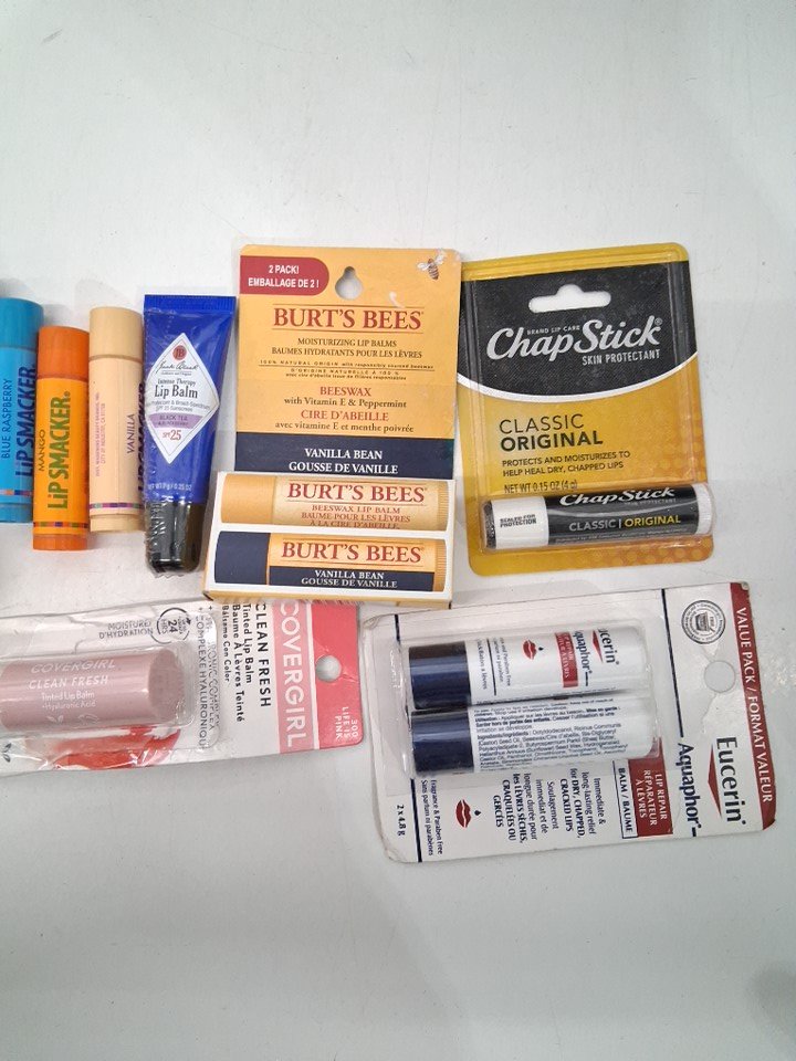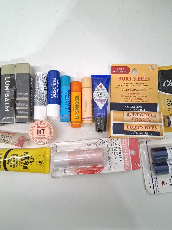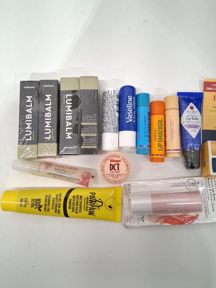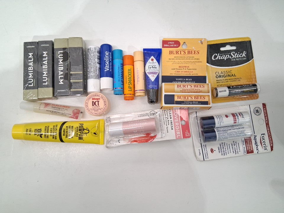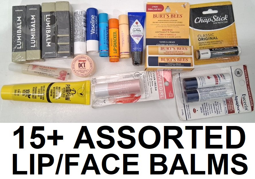 15+ assorted lip and face balms - assorted brands, sizes, types and shades - covergirl / luminara / chapstick / aquaphor / vaseline / burt's bees / lip smacker