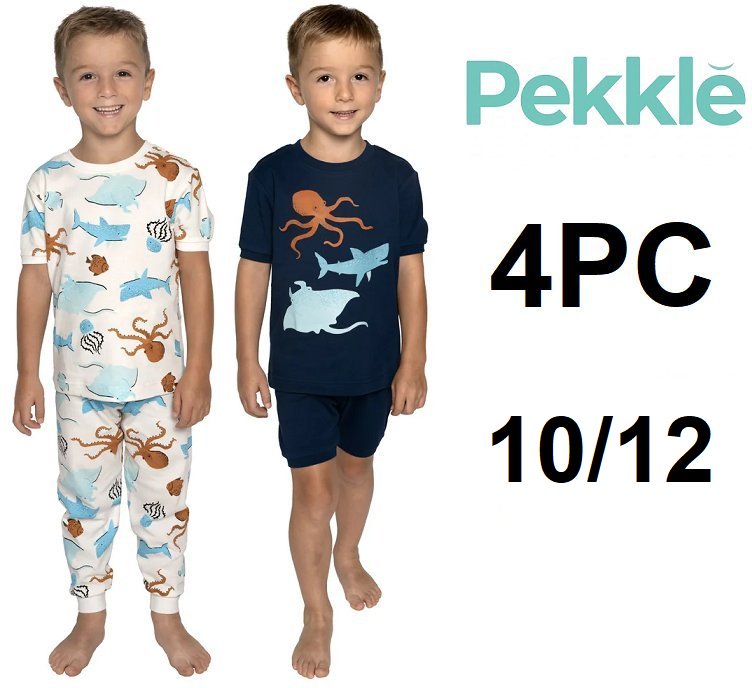 4PC BOY'S pekkle 100% organic cotton pajama set - (2) short sleeve shirts, pants, shorts - size 10/12 - navy blue / octopus (style: 1008251)
