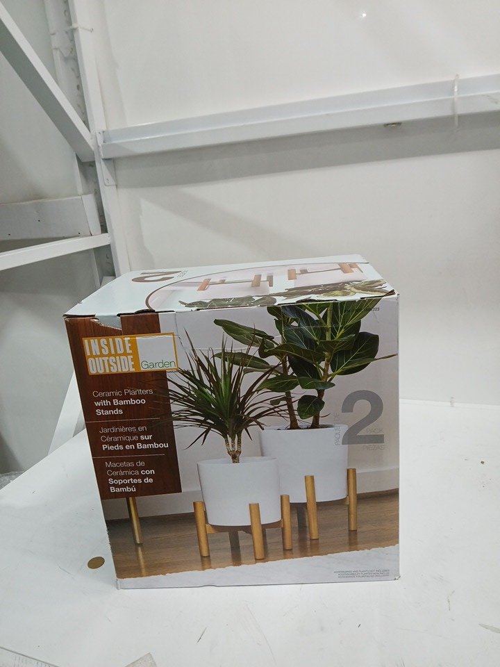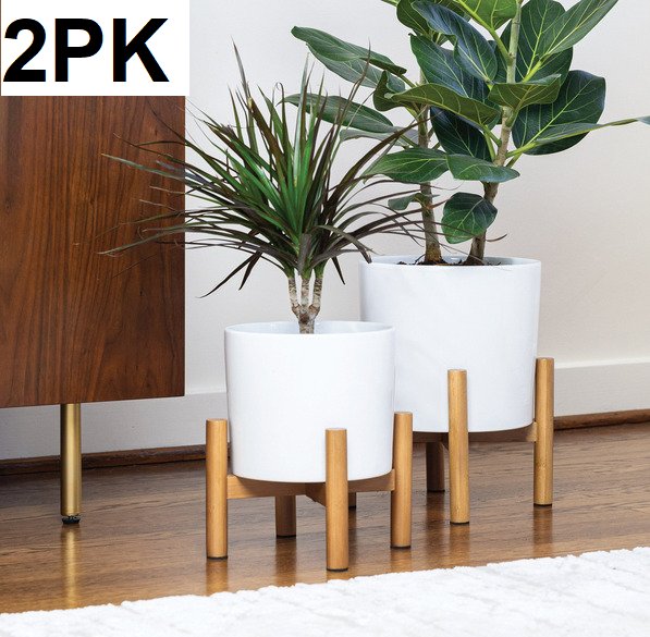 2pk inside outside garden ceramic planters with bamboo stands - 9.2" and 7.7" - white/beige (model: 1807223)