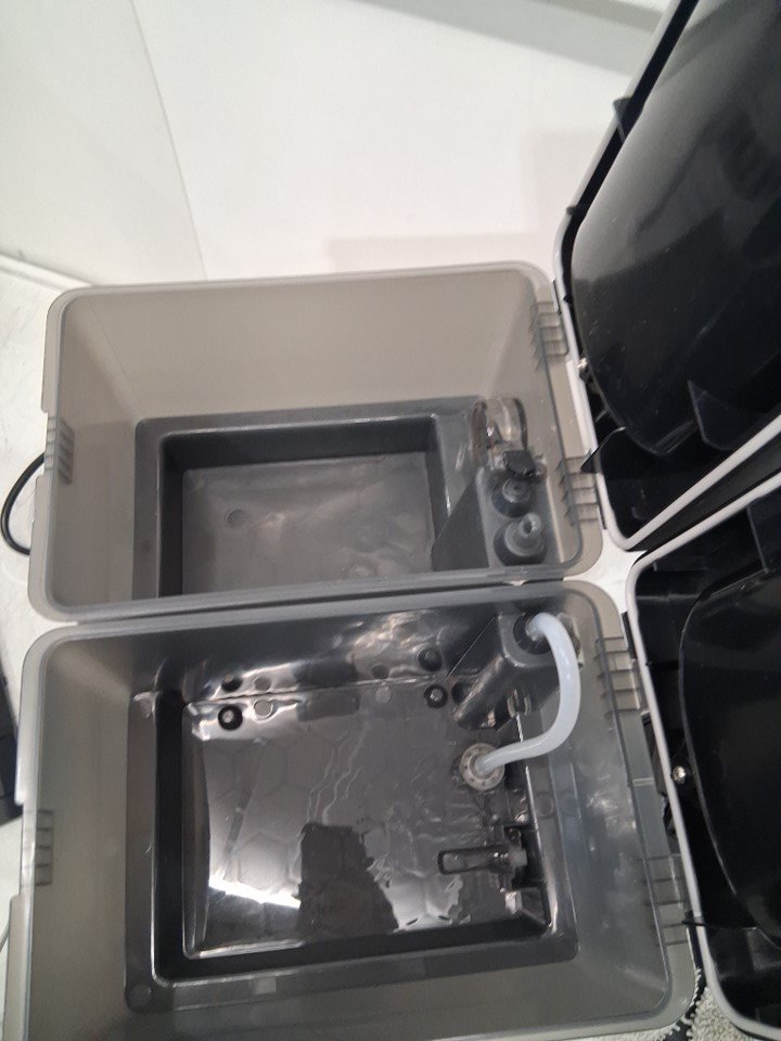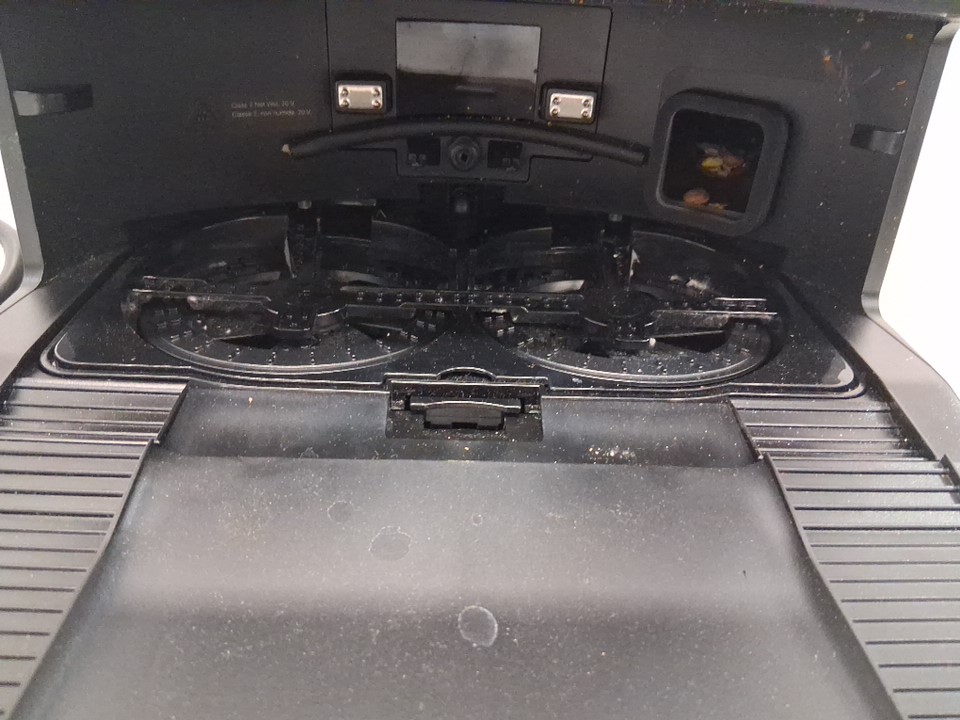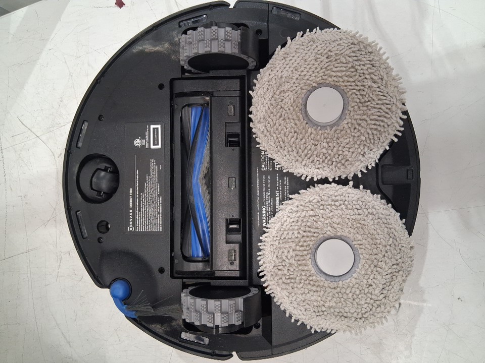 Light wear on the side brush, main brush and mop pads and dirt/debris on/inside the robot vacuum and base station from previous use. Item was tested for power
