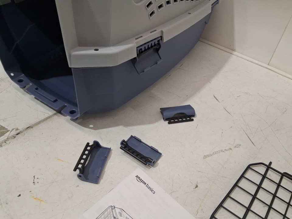 item has a small crack in back corner ( see photos) one clip is attached to carrier