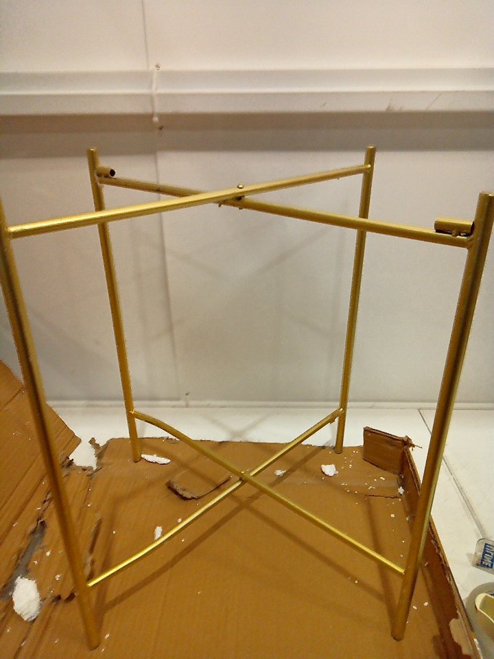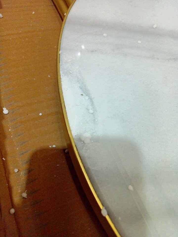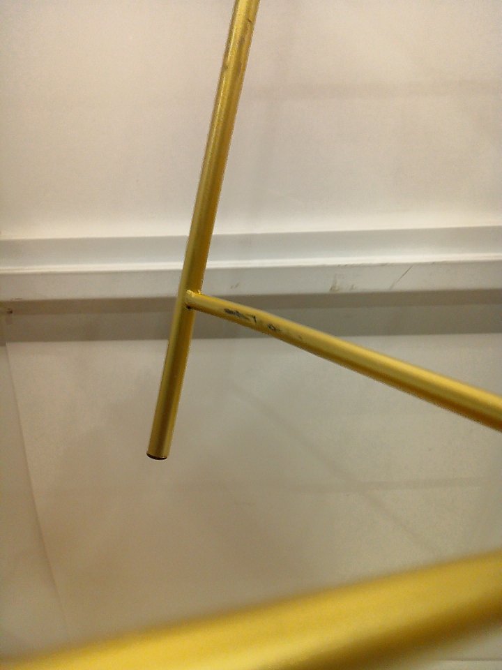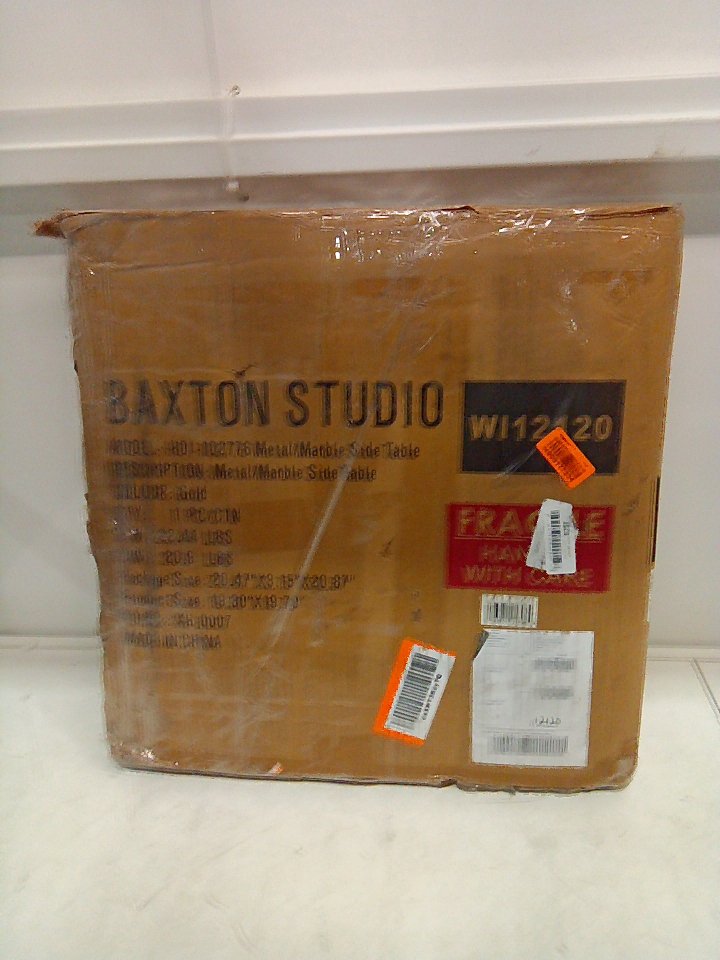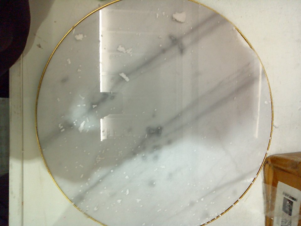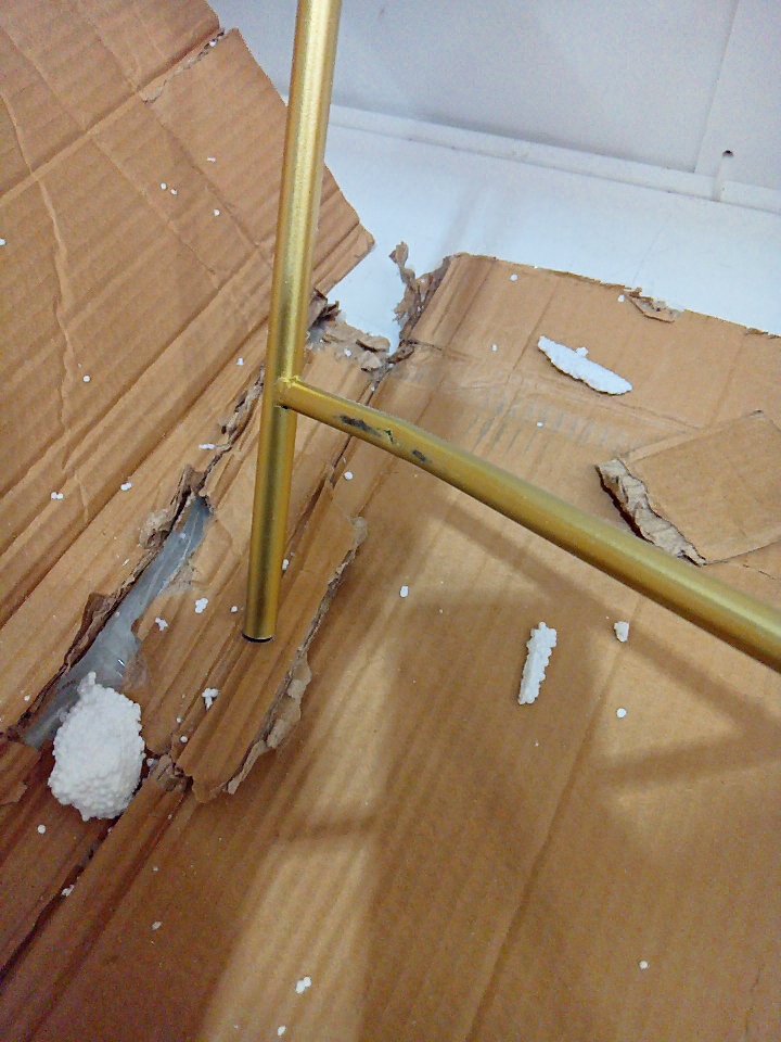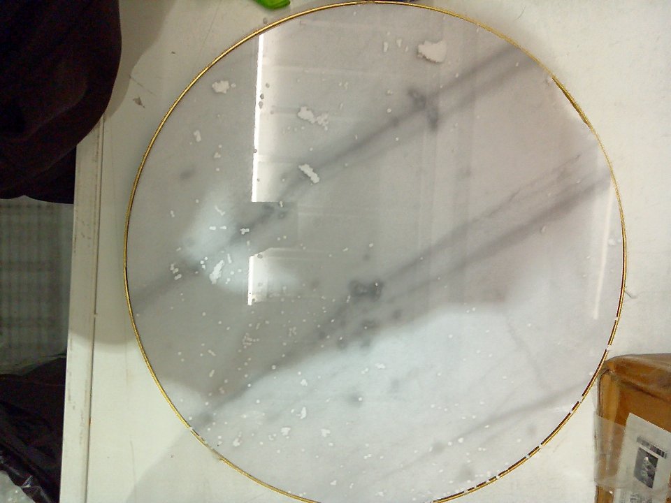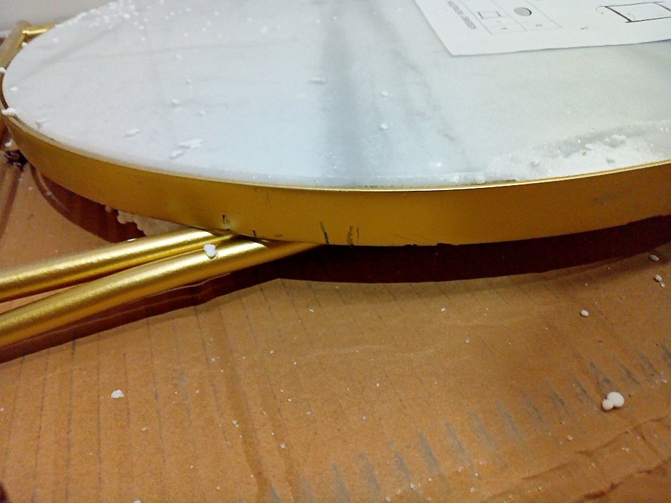 There is a small dent on the bottom of the legs and some paint chipping on that area. There is a small 1-2" chunk of marble cracked off of the table's top edge. (SEE PHOTOS)