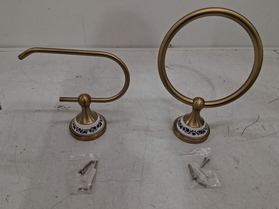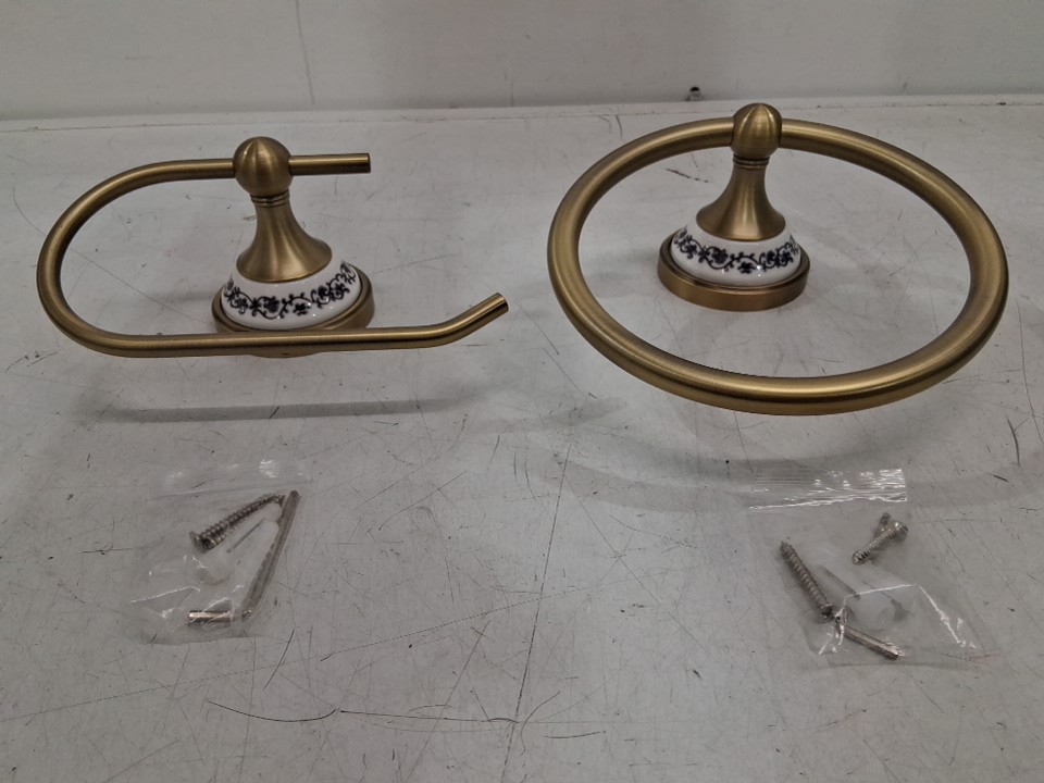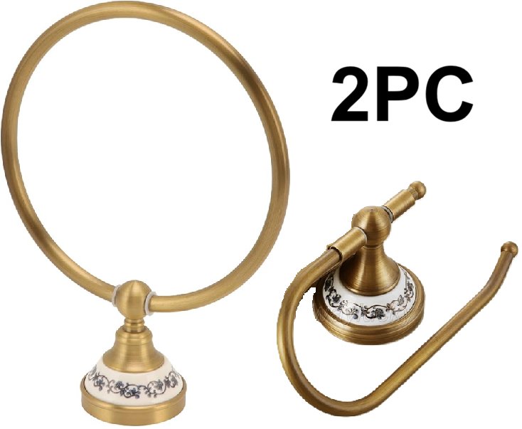 2PC Hosi Wall Mounted Antique Brass Bathroom Toilet Paper Holder and Hand Towel Ring - Gold/White