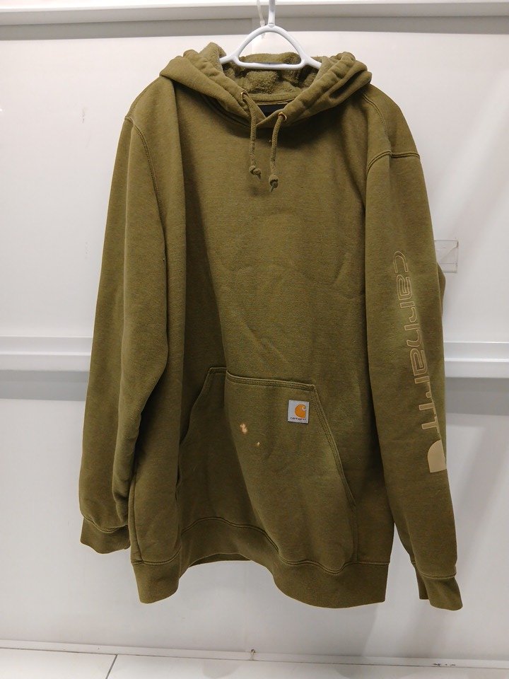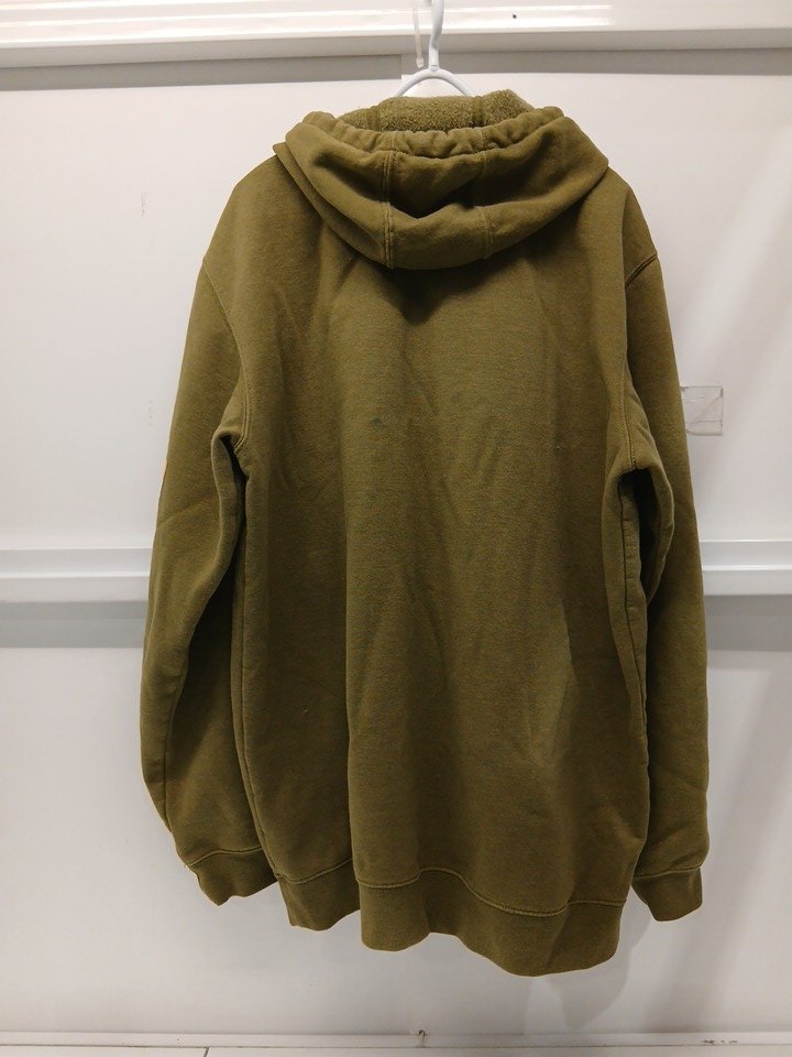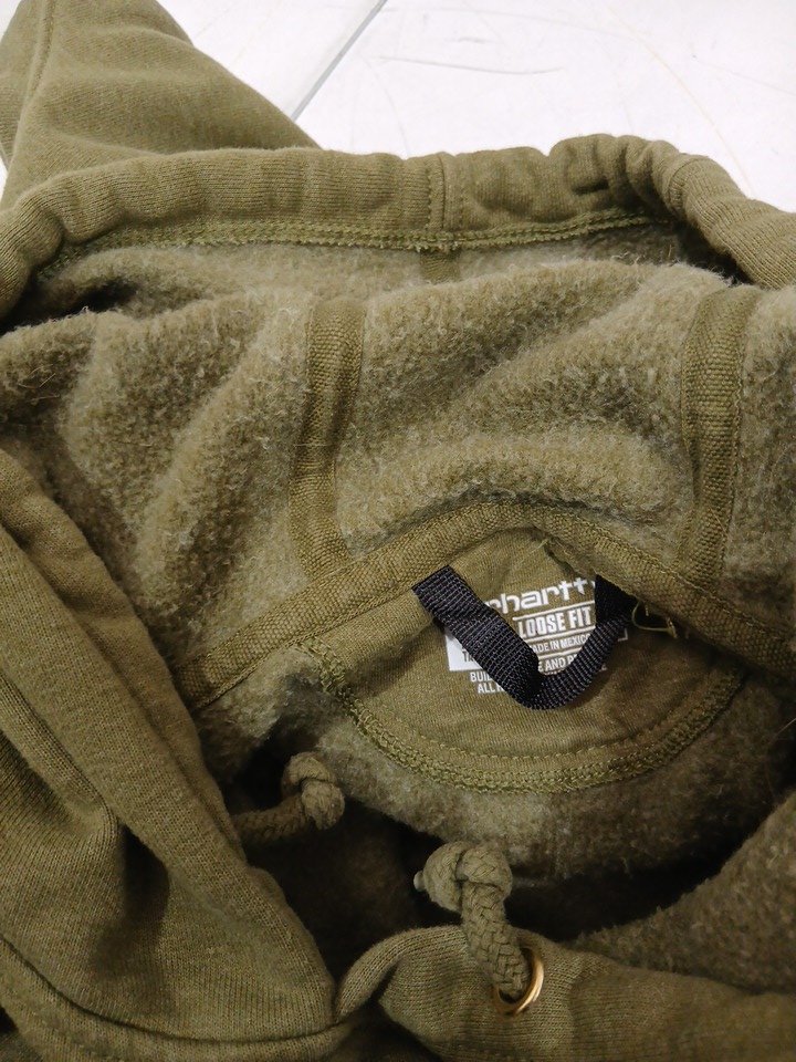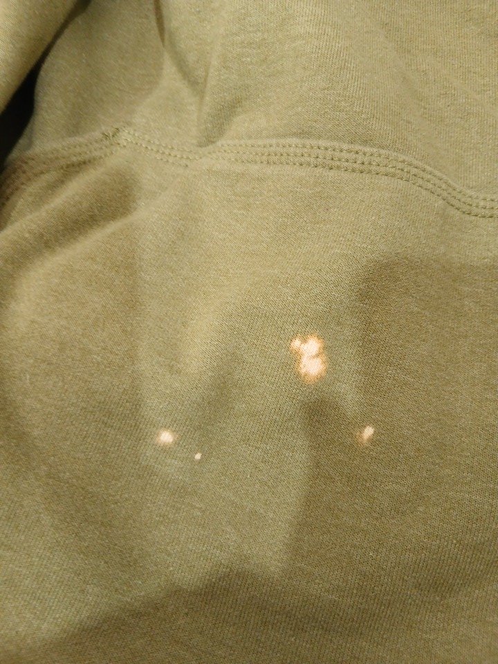 appears heavily used due to a few bleach stains on the front pocket, fuzziness of the inner fleece lining, and a cologne/detergent smell.