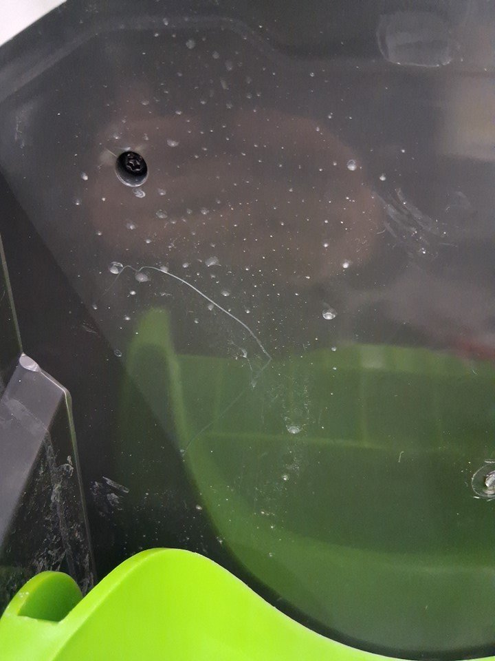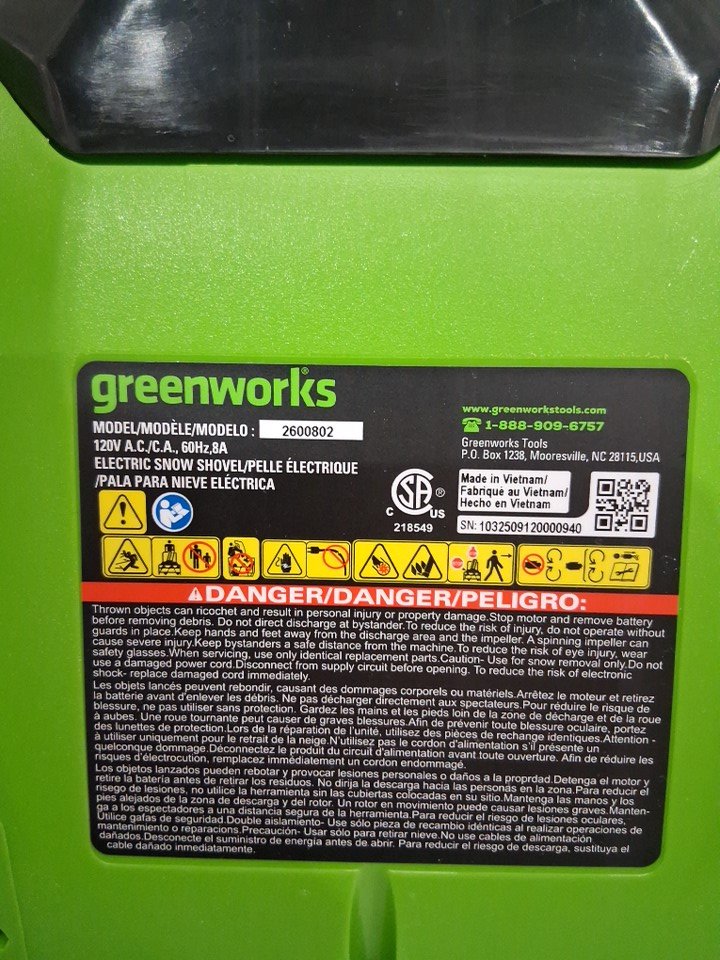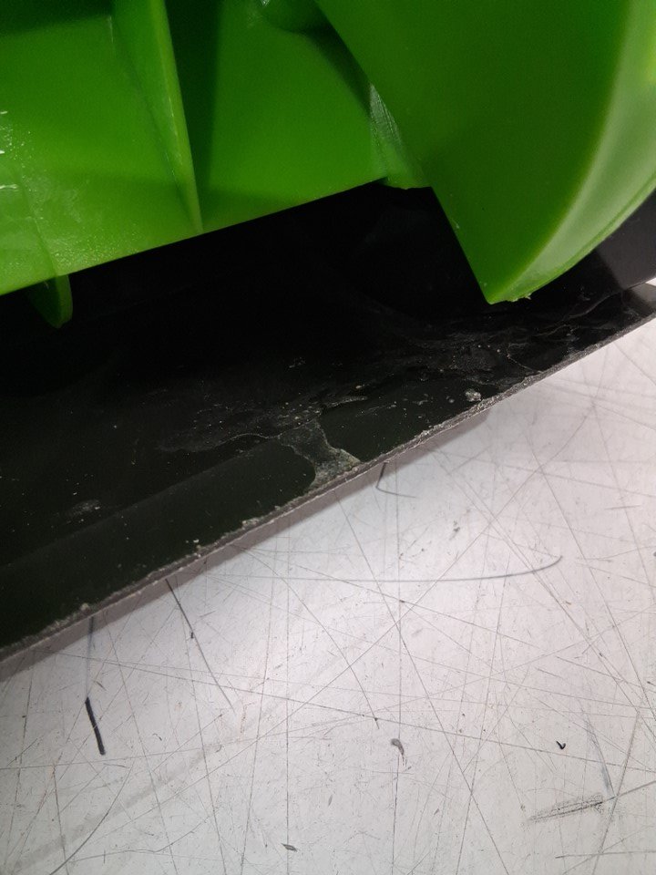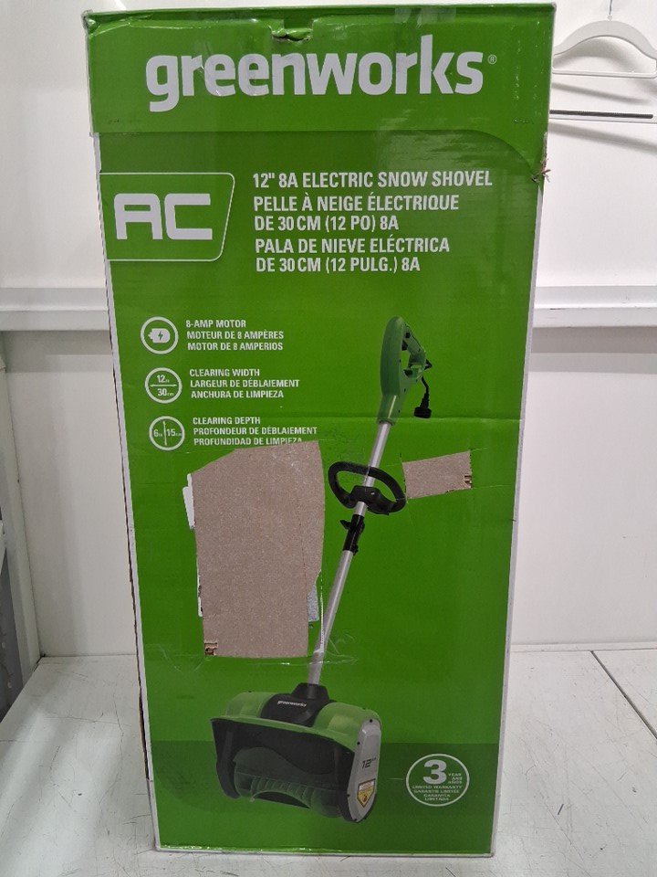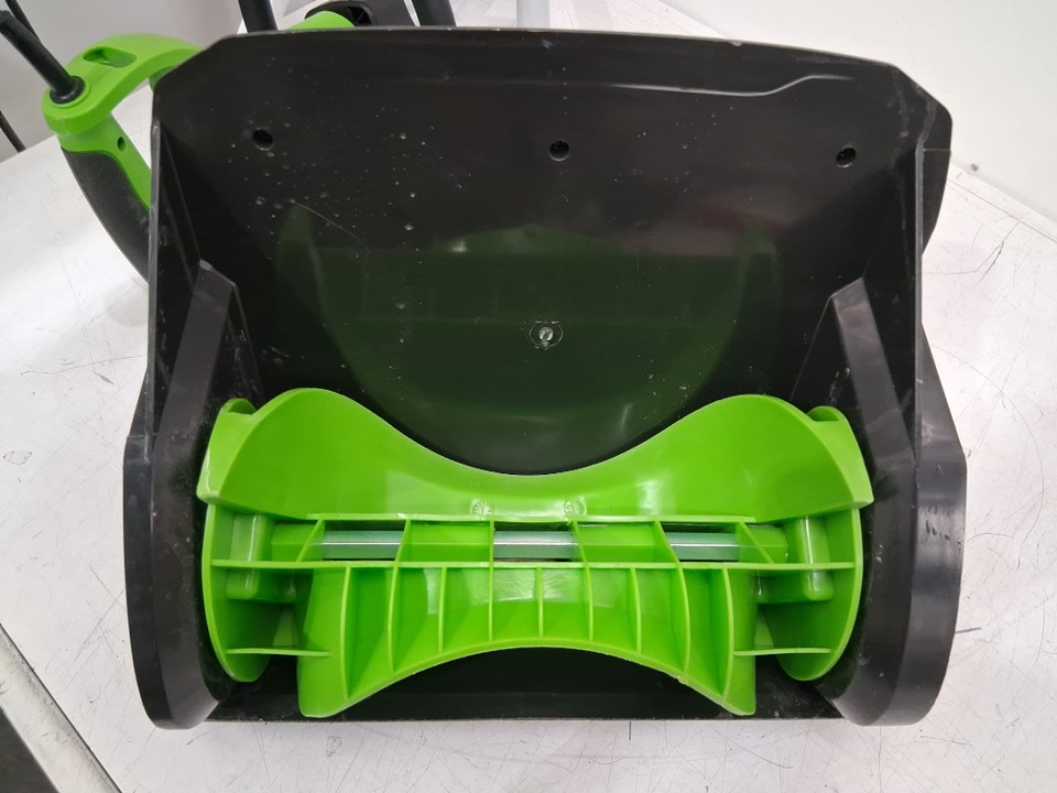 There is snow residue and scrape marks on the bottom of the shovel due to previous use.