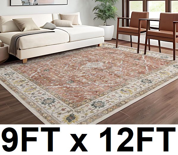 Deerly Area Rug Vintage Floral Medallion Boho Oriental Non-Slip - 9FT X 12FT - brick red