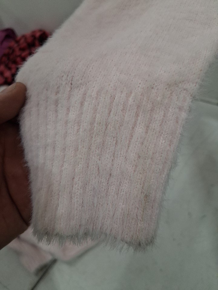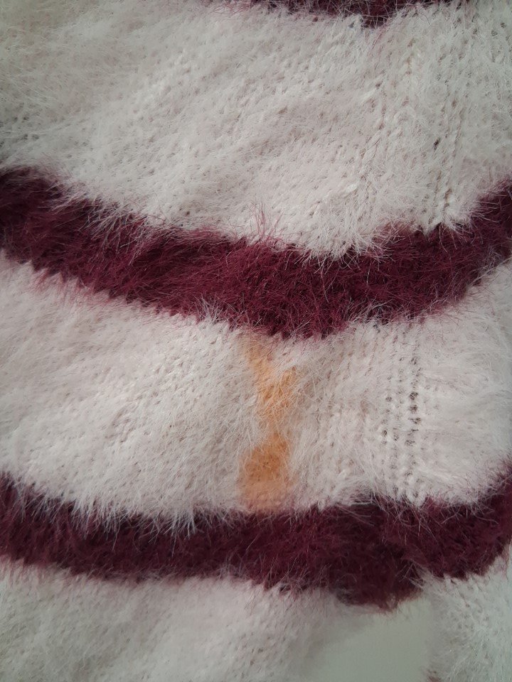 Some dust is on the sleeve and there is a cosmetic stain of unknown origin on the sleeve of the garment.