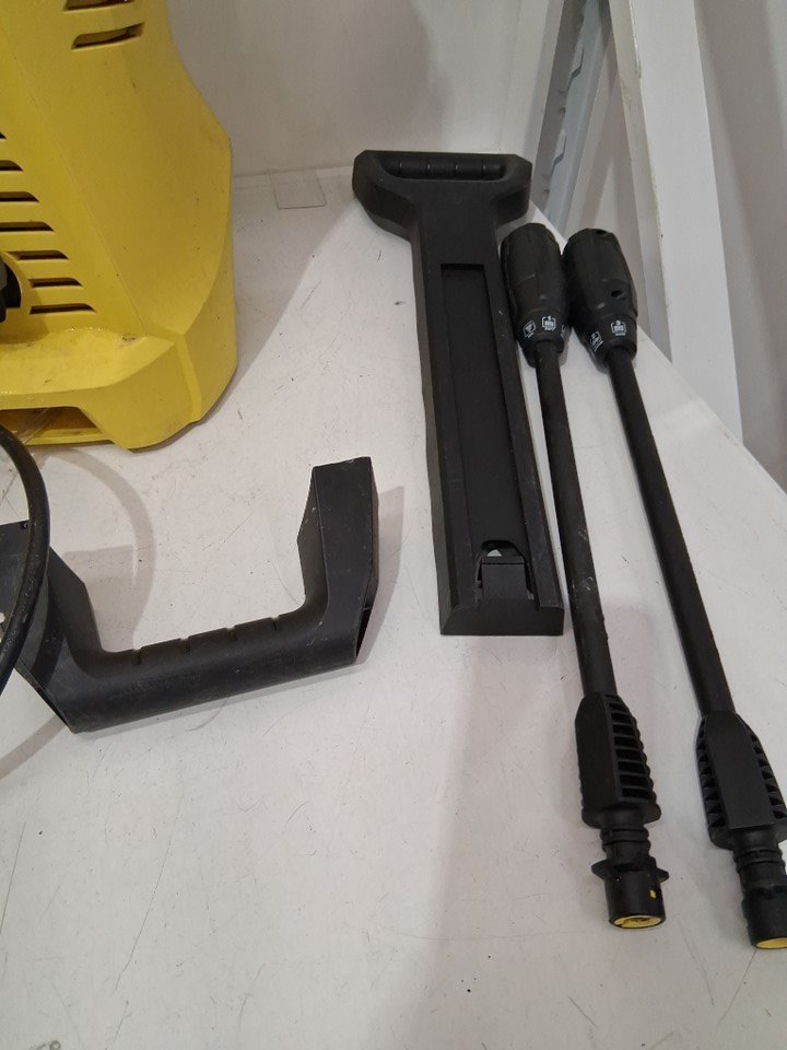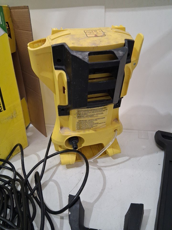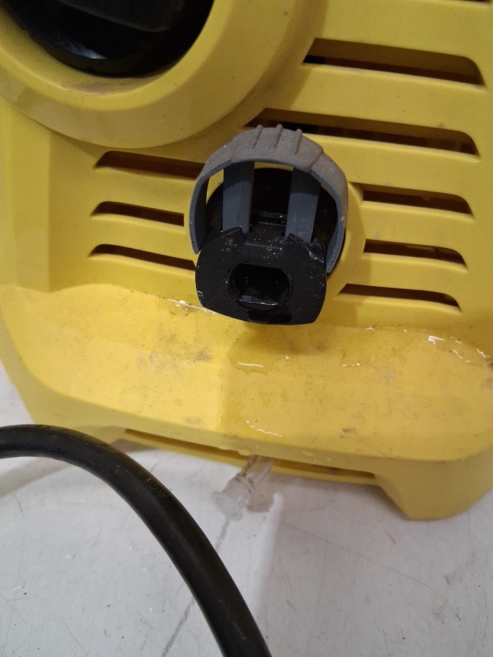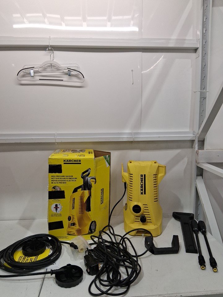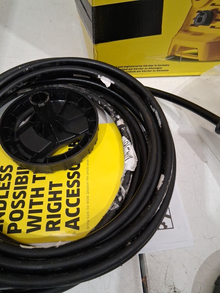 Tested for power. Missing the gun. Has some dirt/water residue on the surface and the hose has some sticker residue on it.