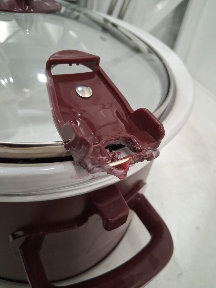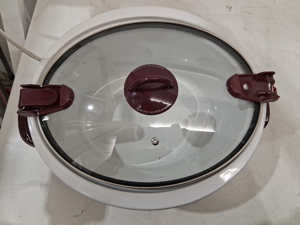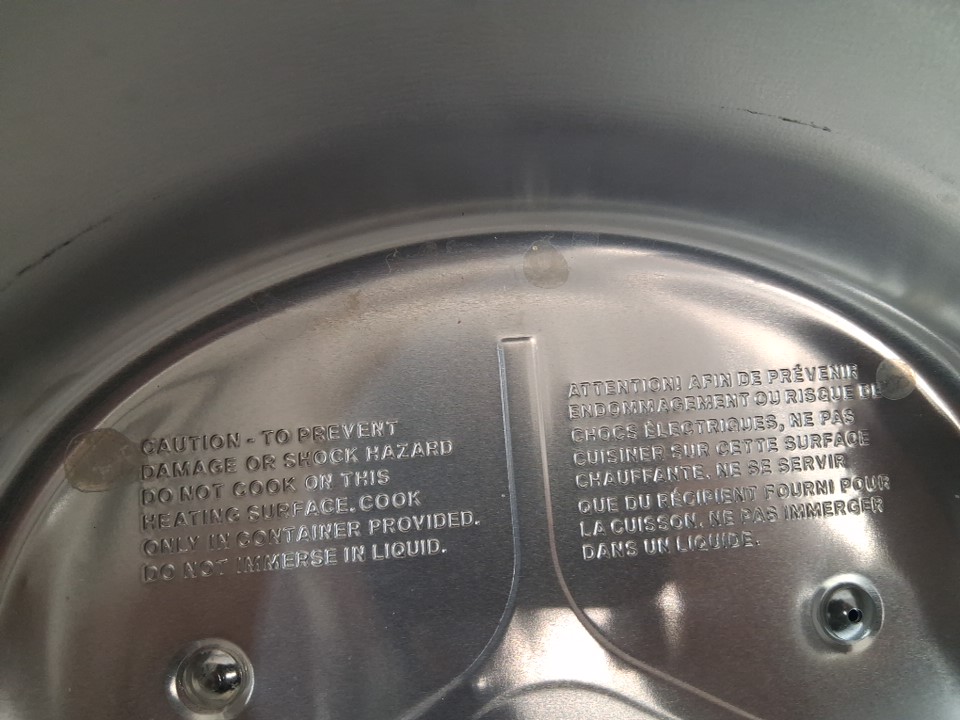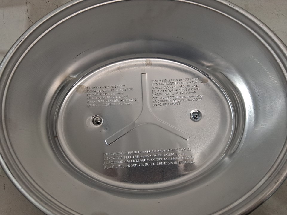 One of the latches on the lid appears to have melted off leaving some discoloration on one edge of the pot, and there are some light stains on the metal under the pot indicating some prior usage - see photos. Outside of the broken latch, appears to be in very good condition with no other damage or visible issues. Tested for basic power and heat.