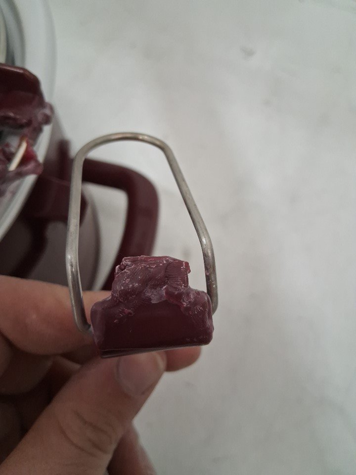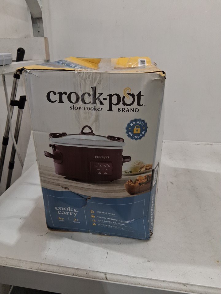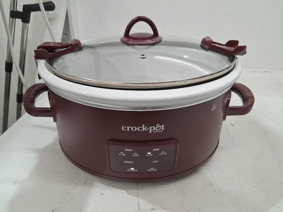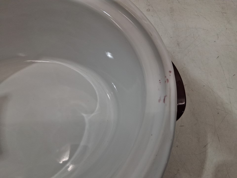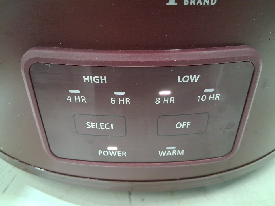 One of the latches on the lid appears to have melted off leaving some discoloration on one edge of the pot, and there are some light stains on the metal under the pot indicating some prior usage - see photos. Outside of the broken latch, appears to be in very good condition with no other damage or visible issues. Tested for basic power and heat.