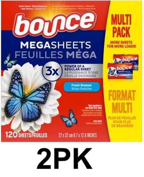 2PK BOUNCE WrinkleGuard Mega Dryer Sheets - fresh scent - (120 total count)