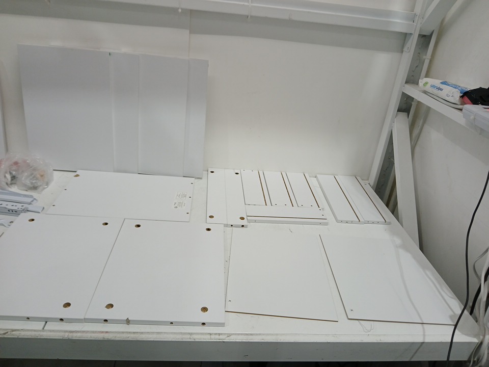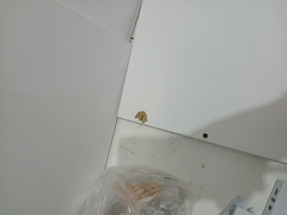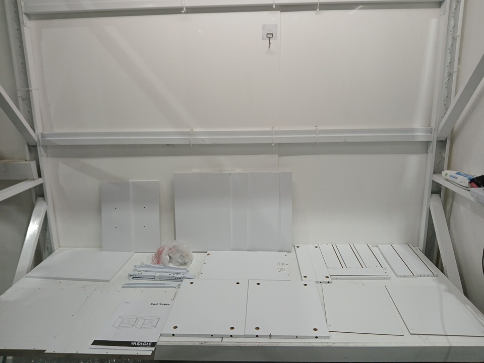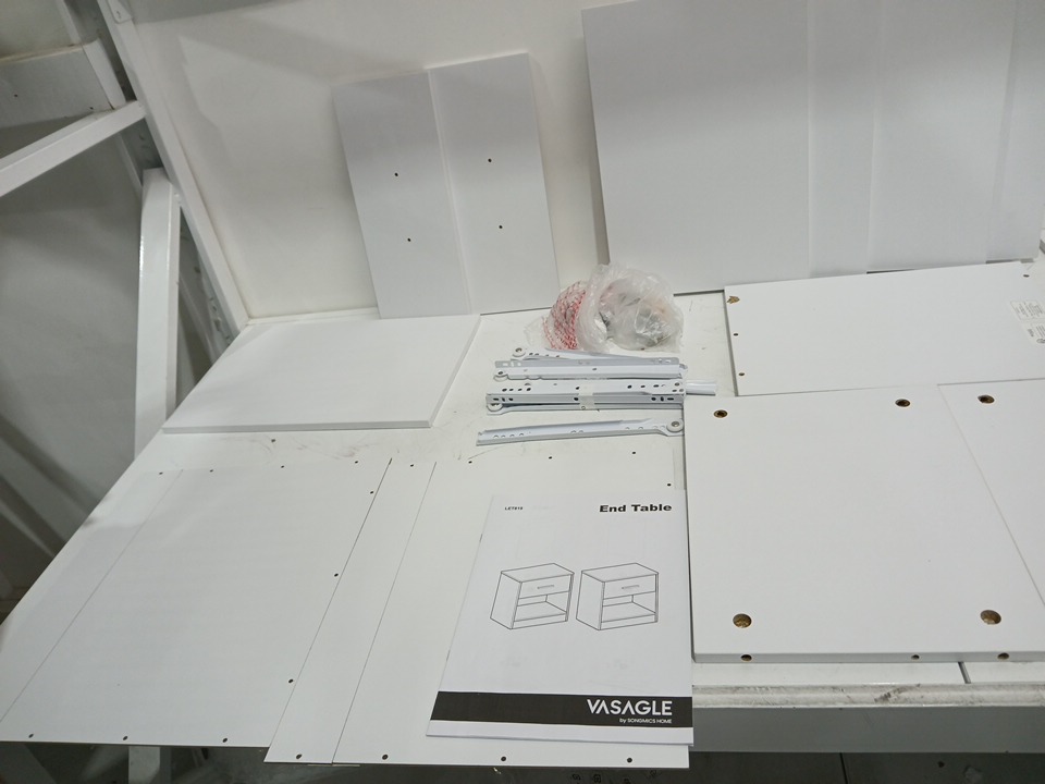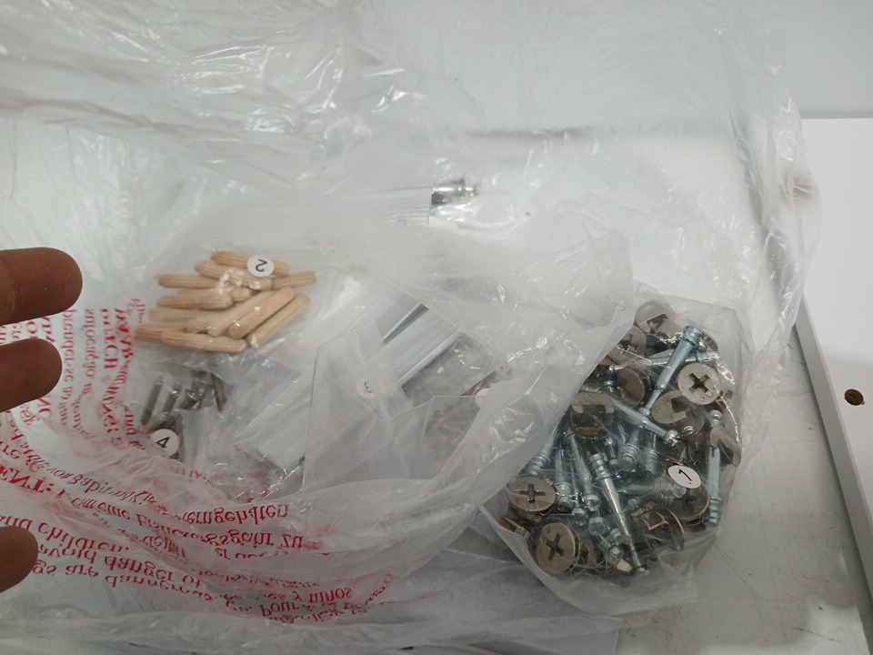 loose hardware and chipping finish by holes indicates previous assembly, allp iece required for assembly are included, may need additional generic hardware