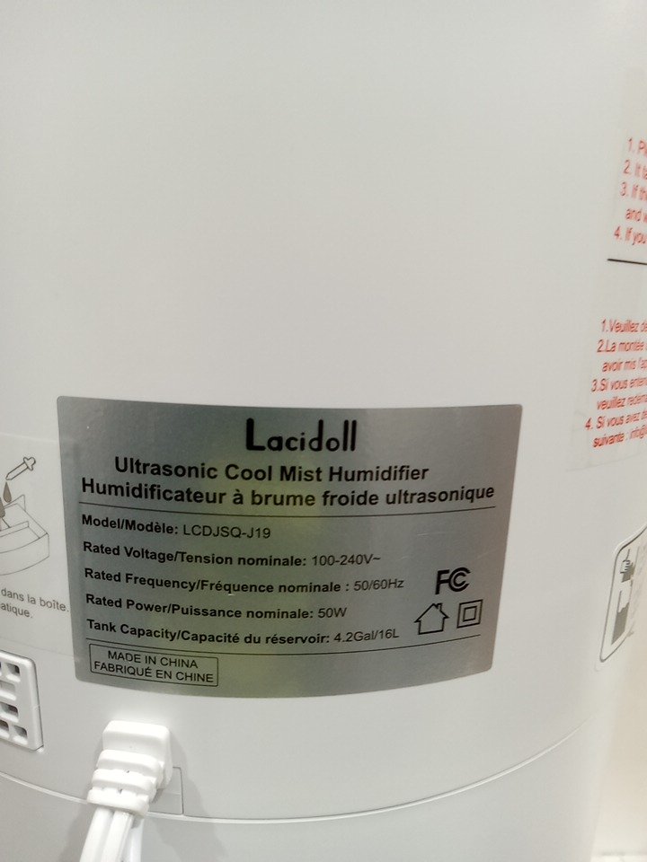 Lacidoll Ultrasonic Cool Mist Humidifier - 16l - 1500sq.ft - white (model: lcdjsq-j19)