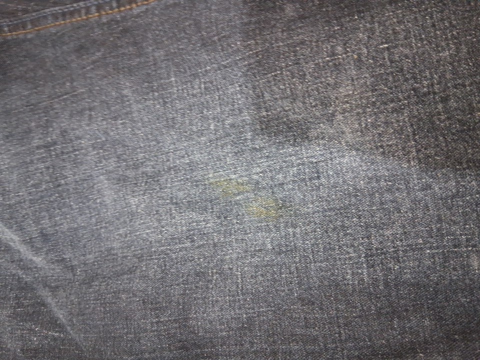 pants have some white markings on the bottom of pant leg and a small stain on right leg around the knee area ( see photos)