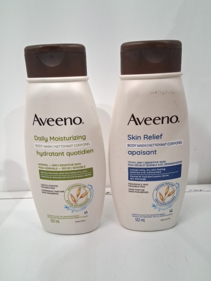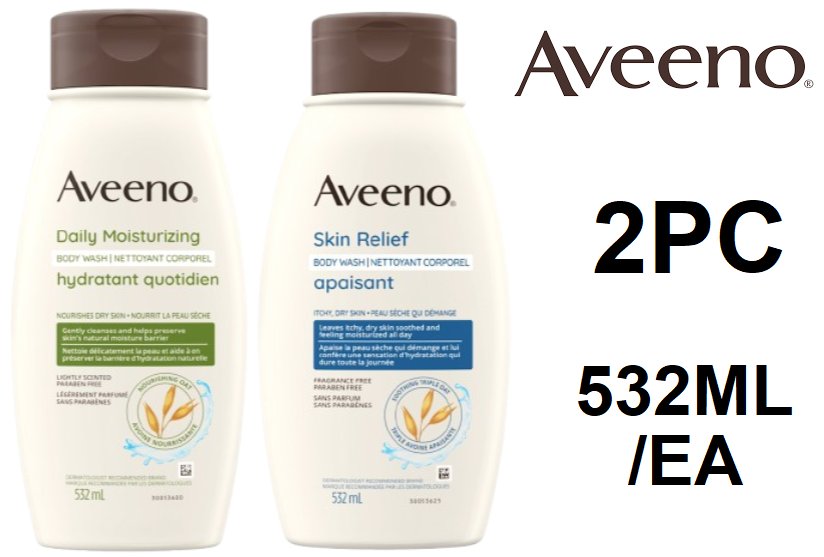 2pc aveeno body washes - 532ml each - daily moisturizing normal to dry sensitive skin with mild scent / fragrance free skin relief itchy dry sensitive skin