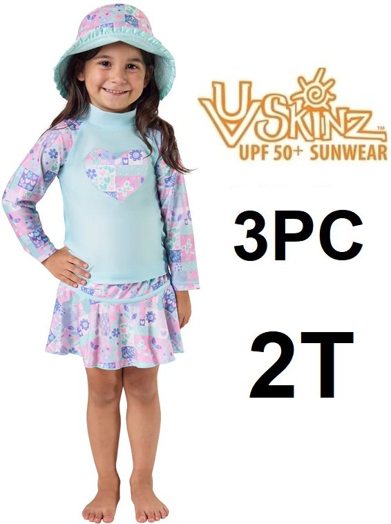 3pc TODDLER GIRL'S uv skins upf 50+ sunwear swim suit and hat set - 2T - blue / pink flowers (style: 8072777 )