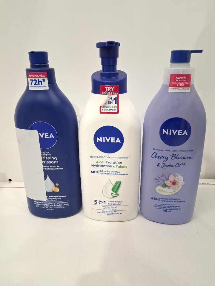 3pc nivea body lotions/milk - 625ml/500ml - nourishing body milk / aloe hydration body lotion / cherry blossom oil in lotion