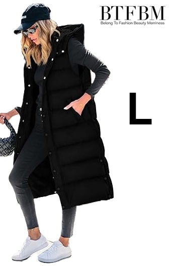 women's btfbm hooded long quilted zip-up puffer vest - large - black (style: BT508)