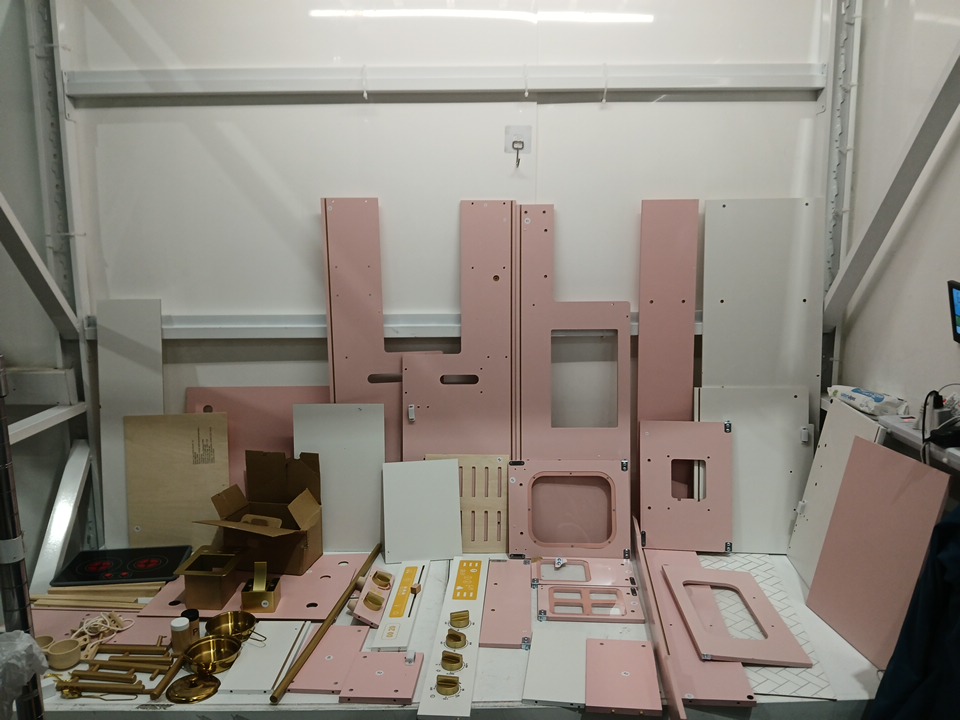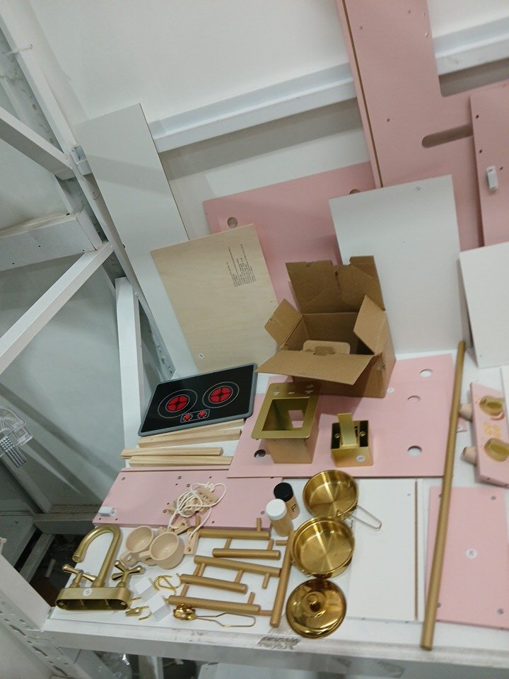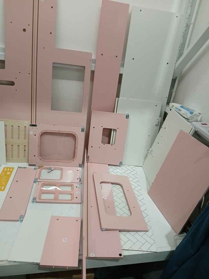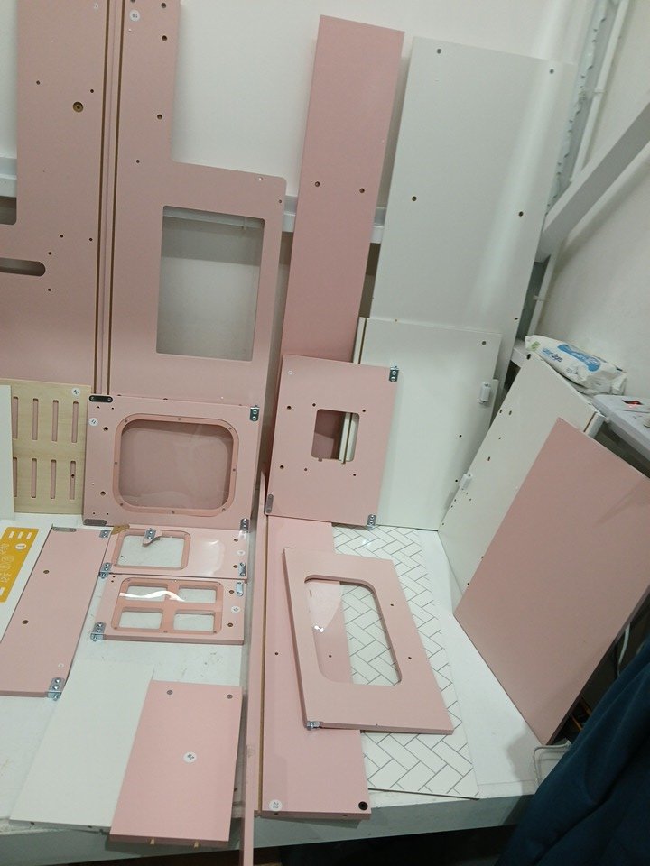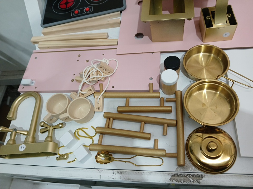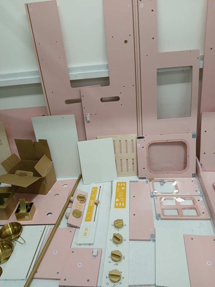item has signs of previous assembly overall and is missing some generic accessories and hardware. There is damage to one of the door hinges while missing accessories such as spatula and cup.