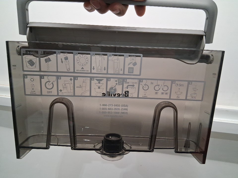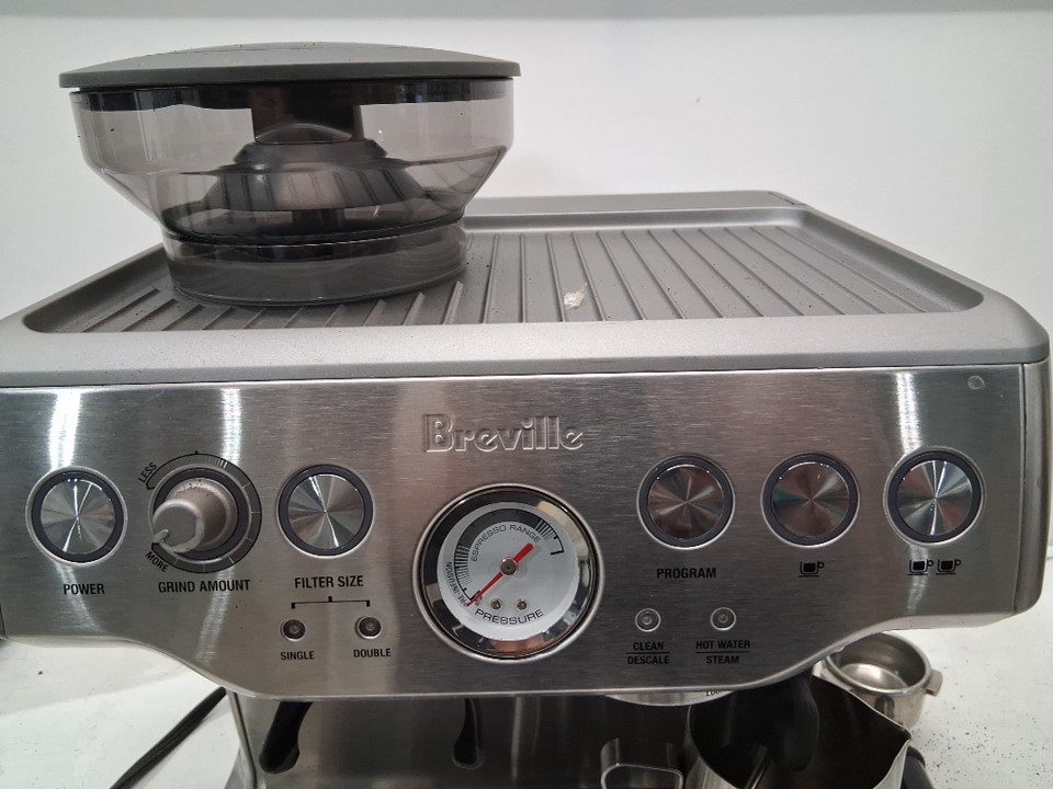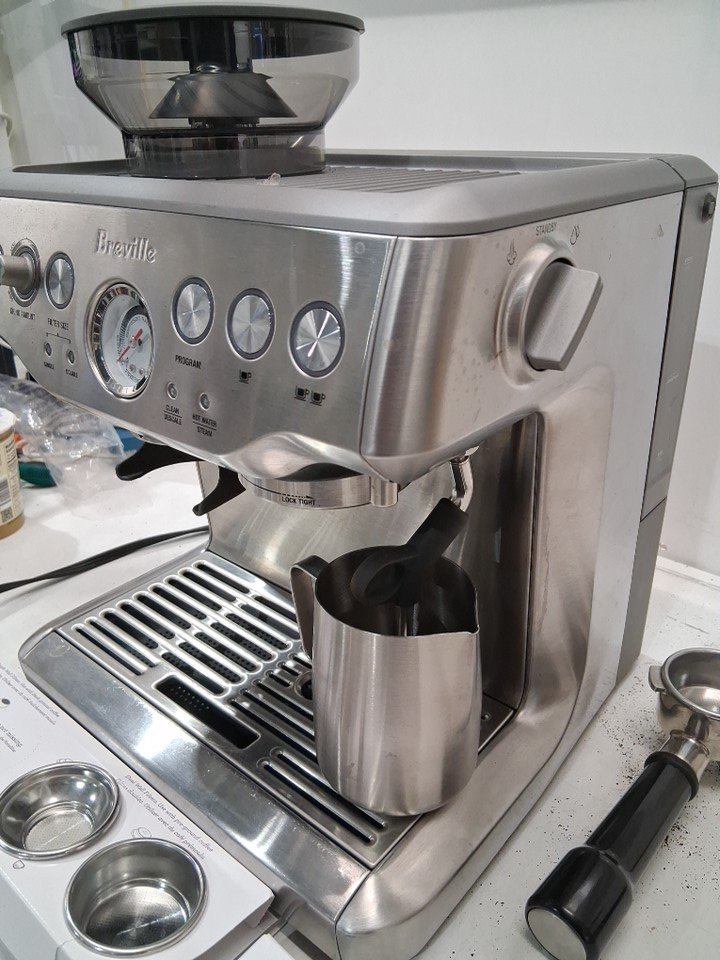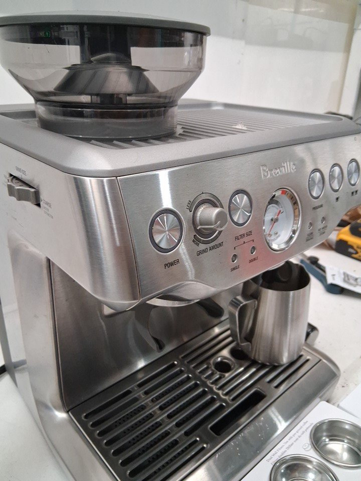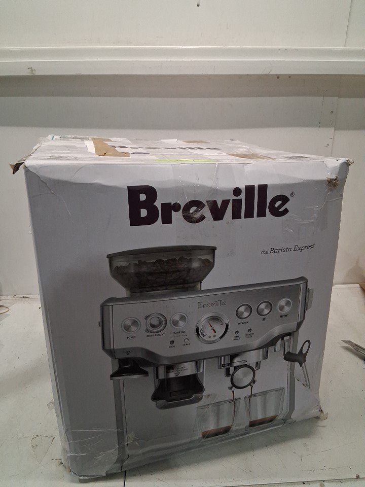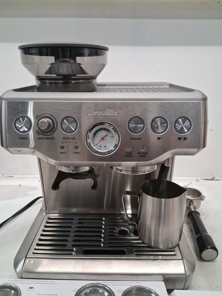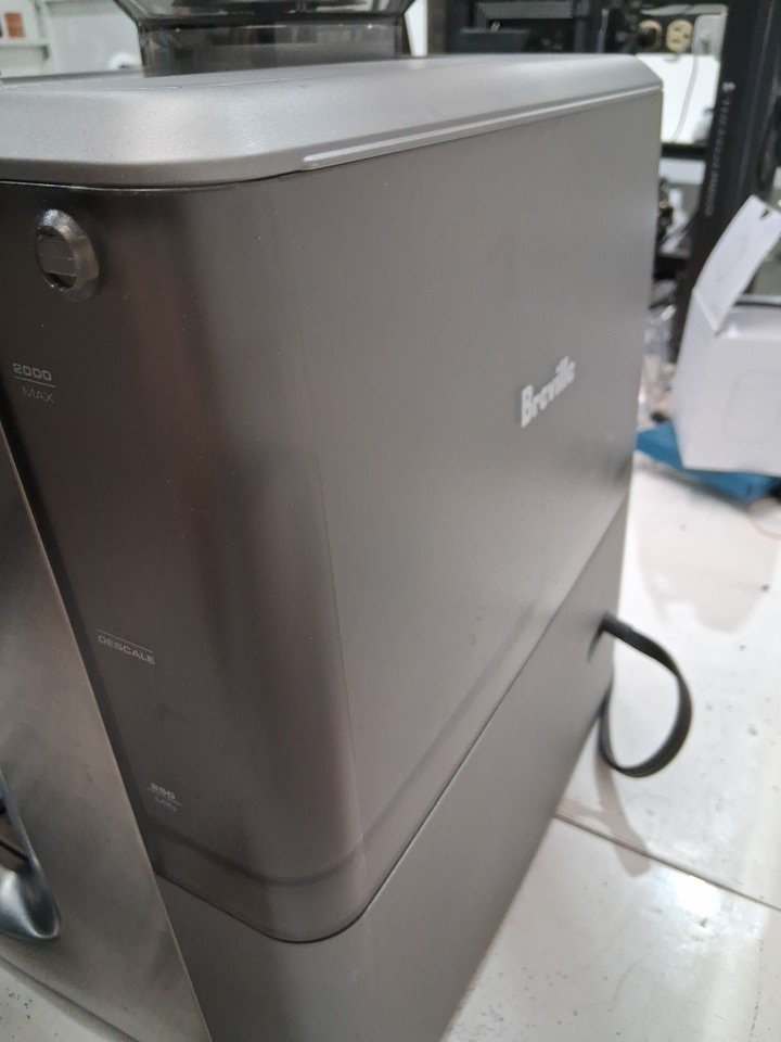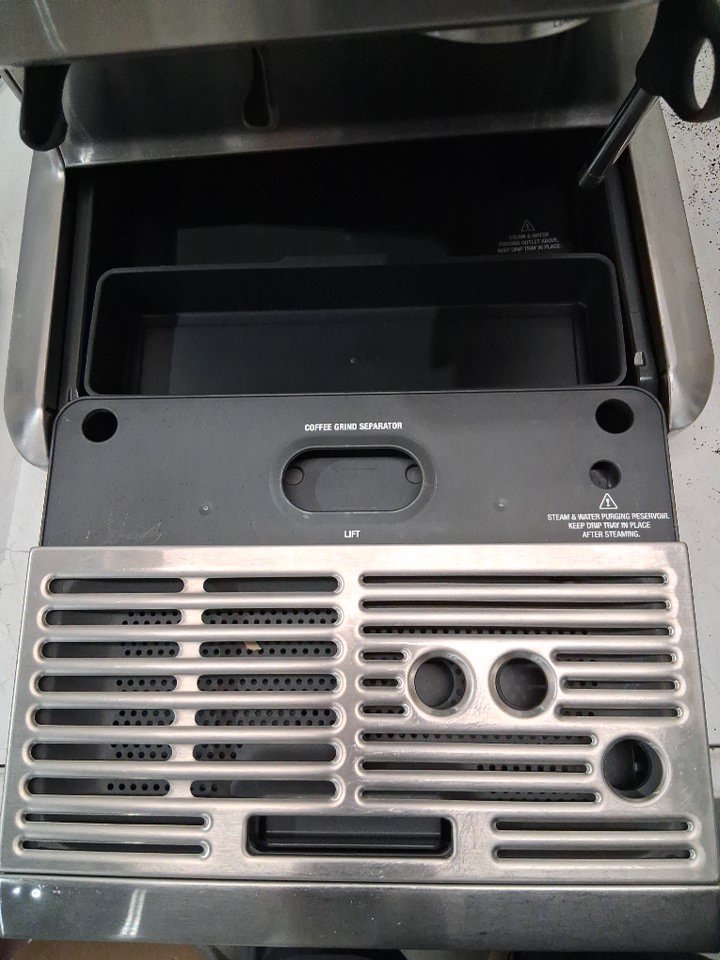 + Water tank is cracked at the bottom + + missing tamper, has residual coffee grounds, scuffs and scratches + + DOES NOT POWER ON +