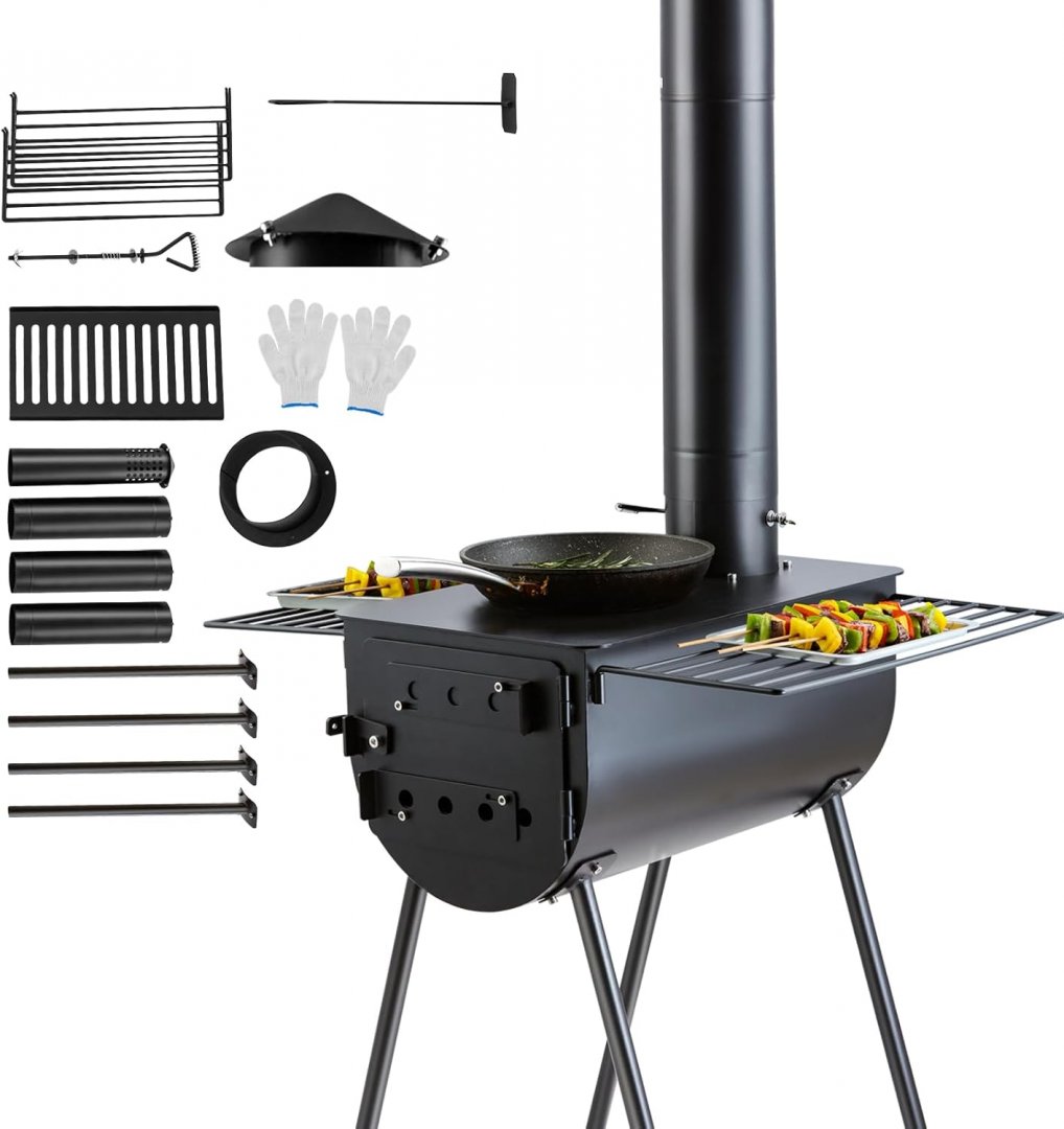 Alloy Steel Camping Tent Stove Portable Wood Burning Stove with Chimney Pipes & Gloves - 118" - black (model: v0ld-002a)