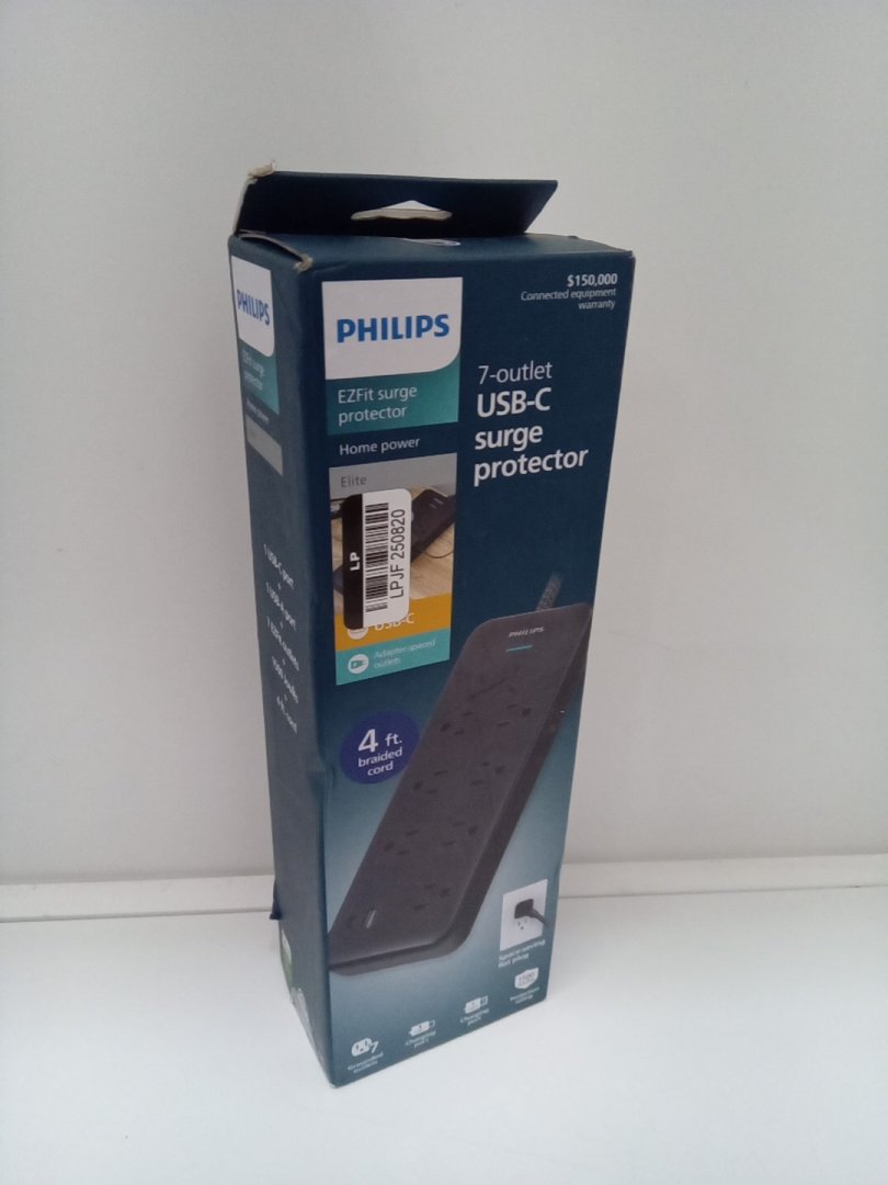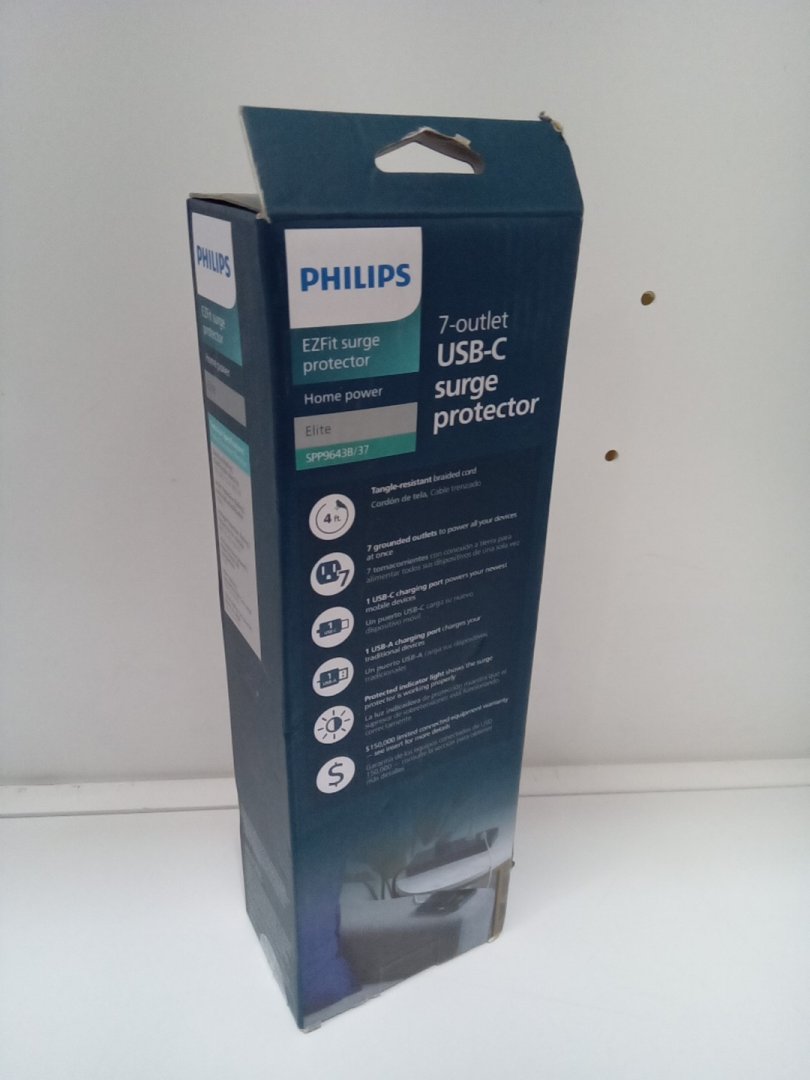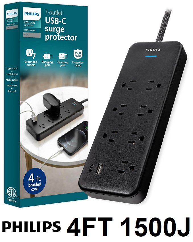 Philips ezFit Surge Protector Elite with 7 Outlets, Flat Plug, Braided Cord, USB-C and USB-A Ports - 4FT - 1500J - Black (Model: SPP9643B/37)