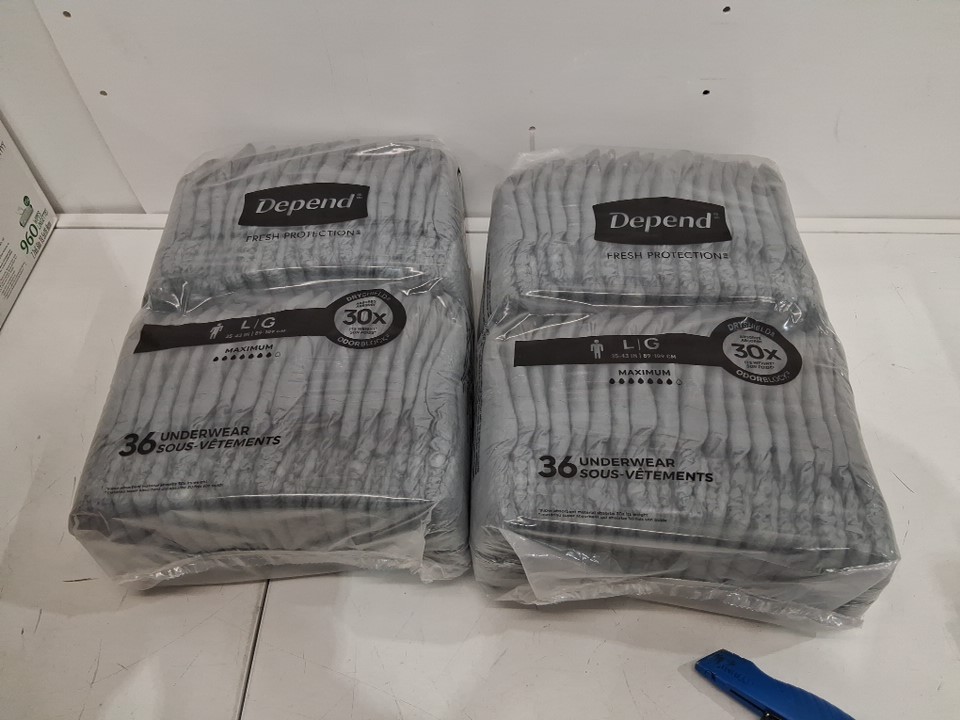 72PK MENS DEPENDS MAXIMUM ABORPTION INCONTINENCE DIAPERS WITH DRYSHIELD TECHNOLOGY LARGE - GREY (MODEL: 54203)