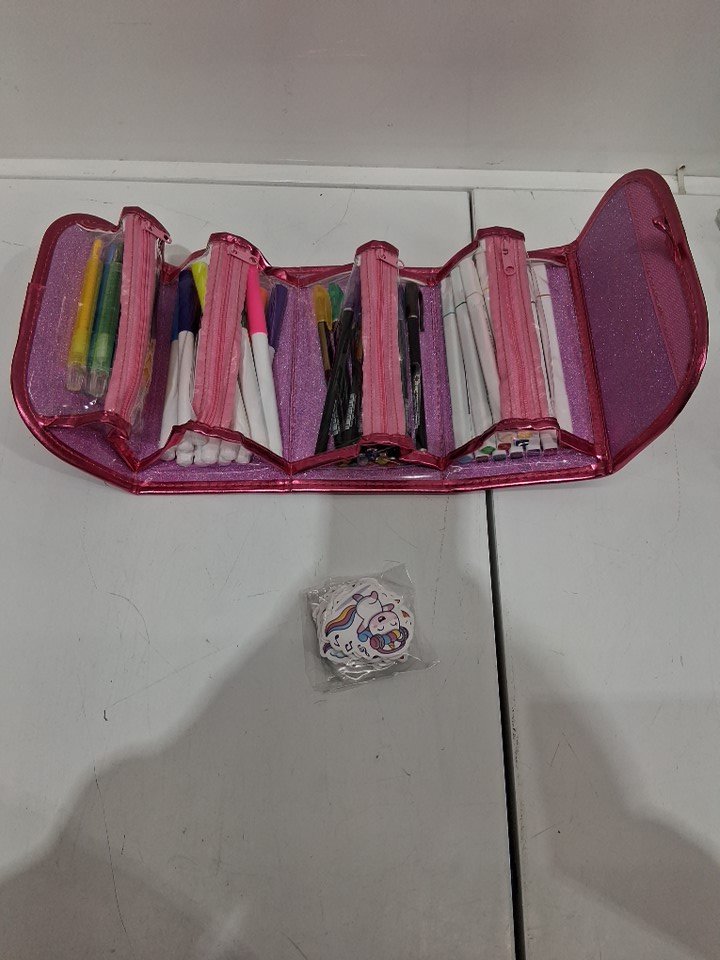 69PC beefunni Unicorn coloured marker and pen set with glitter pencil case and stickers - Unicorn/pink glitter