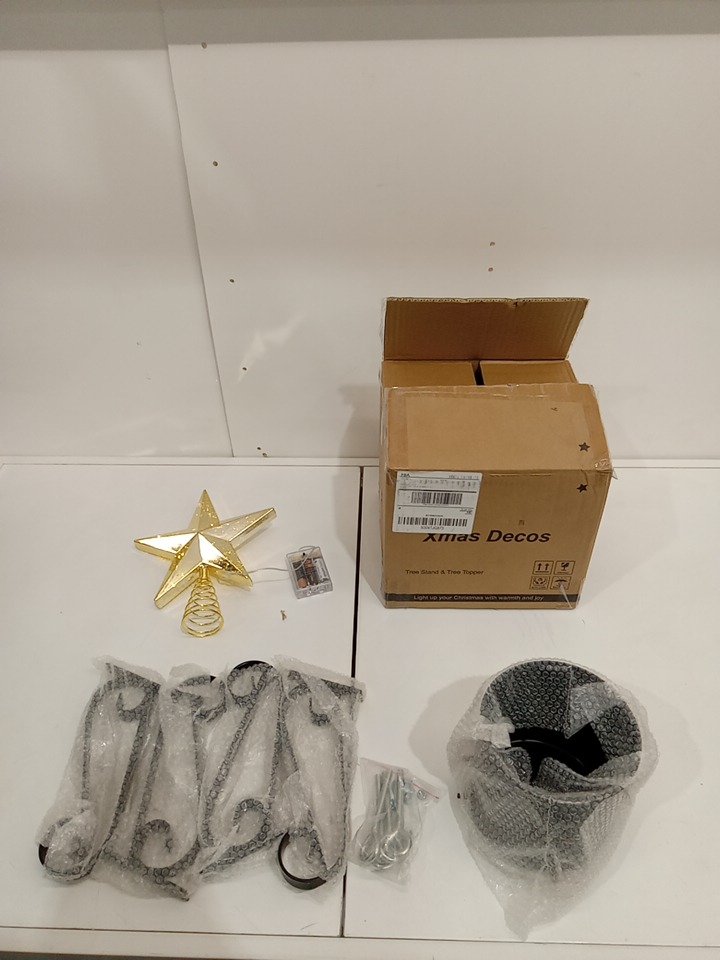 Christmas Tree Stand AND LED star topper ordainment for Real & Artificial Trees - Base Holds up to 10 ft Live or artificial Trees - gold & black (model:XMASSDSDZ)