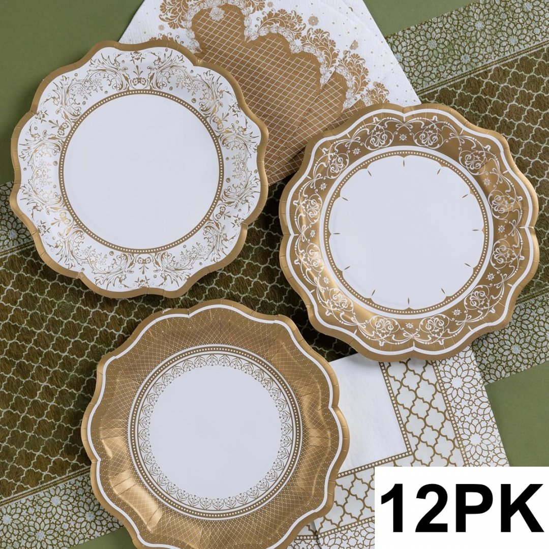 12PK Disposable Paper Party Plates - 9" - Assorted Gold/White
