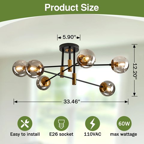 FARMHOUSE Modern Flush Mount Ceiling Glass Chandelier - 6 LIGHTS - 12" X 33" - BLACK/GOLD