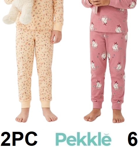 2PC GIRL's pekkle 100% organic cotton pajama pants - 6 - yellow floral / pink cats (style: 3378844)